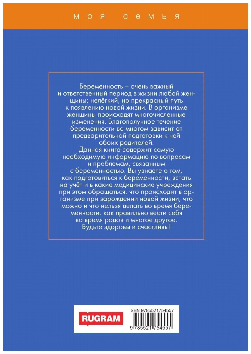 Беременность - очень важный и ответственный период в жизни любой женщины; нелёгкий, но прекрасный путь к появлению новой жизни. В организме женщины происходят многочисленные изменения. Благополучное течение беременности во многом зависит от предварительной подготовки к ней обоих родителей. Данная книга содержит самую необходимую информацию по вопросам и проблемам, связанным с беременностью. Вы узнаете о том, как подготовиться к беременности, встать на учёт и в какие медицинские учреждения при этом обращаться, что происходит в организме при зарождении новой жизни, что можно и что нельзя делать во время беременности, как правильно вести себя во время родов и многое другое. Будьте здоровы и счастливы!Издательство RUGRAMМягкий переплетОбъем - 194 стр.Формат - 148x210 мм.ISBN 978-5-521-75455-7Год издания: 2022