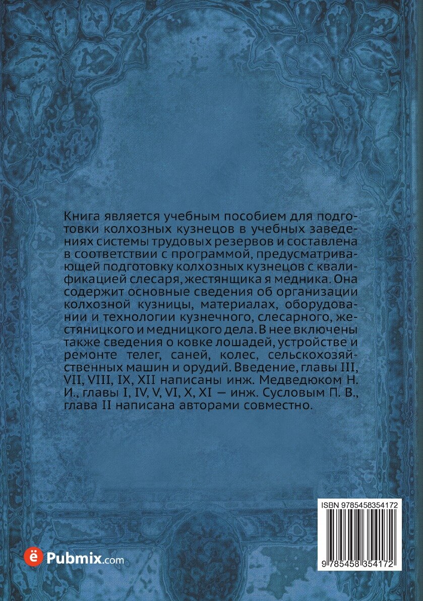Книга является учебным пособием для подготовки колхозных кузнецов в учебных заведениях системы трудовых резервов и составлена в соответствии с программой, предусматривающей подготовку колхозных кузнецов с квалификацией слесаря, жестянщика я медника. Она содержит основные сведения об организации колхозной кузницы, материалах, оборудовании и технологии кузнечного, слесарного, жестяницкого и медницкого дела. В нее включены также сведения о ковке лошадей, устройстве и ремонте телег, саней, колес, сельскохозяйственных машин и орудий. Введение, главы III, VII, VIII, IX, XII написаны инж. Медведюком Н. И., главы I, IV, V, VI, X, XI — инж. Сусловым П. В., глава II написана авторами совместно.