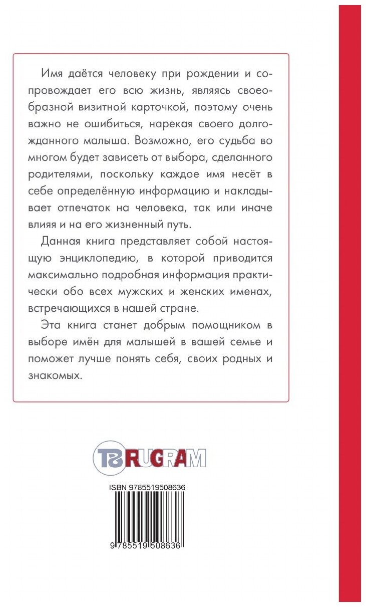 Имя даётся человеку при рождении и сопровождает его всю жизнь, являясь своеобразной визитной карточкой, поэтому очень важно не ошибиться, нарекая своего долгожданного малыша.Возможно, его судьба во многом будет зависеть от выбора, сделанного родителями, поскольку каждое имя несёт в себе определённую информацию и накладывает отпечаток на человека, так или иначе влияя и на его жизненный путь.Данная книга представляет собой настоящую энциклопедию, в которой приводится максимально подробная информация практически обо всех мужских и женских именах, встречающихся в нашей стране.Она не только станет незаменимым советчиком в выборе имени для будущего ребёнка, но и поможет каждому из нас лучше понять себя, своих родных и знакомых.