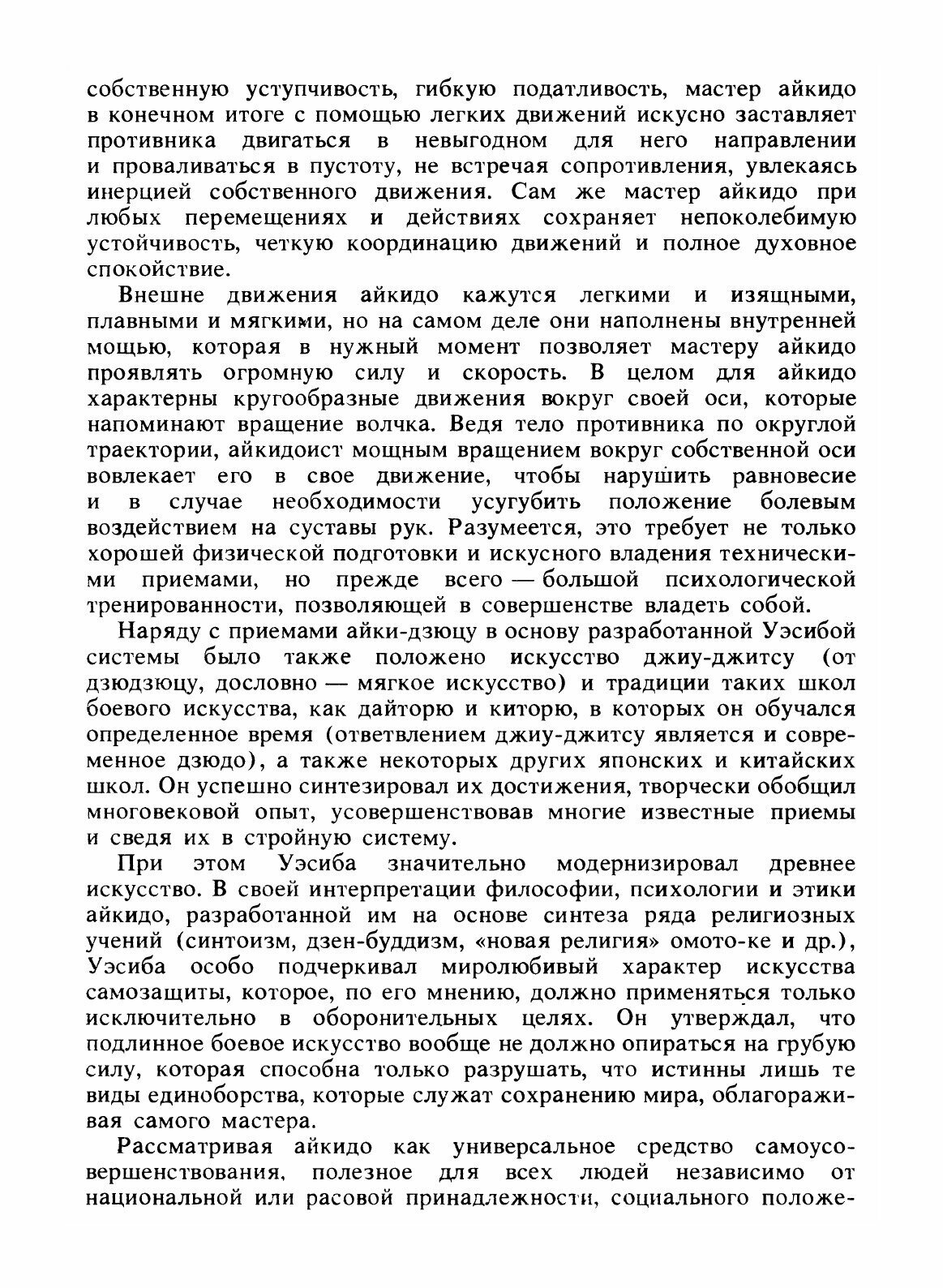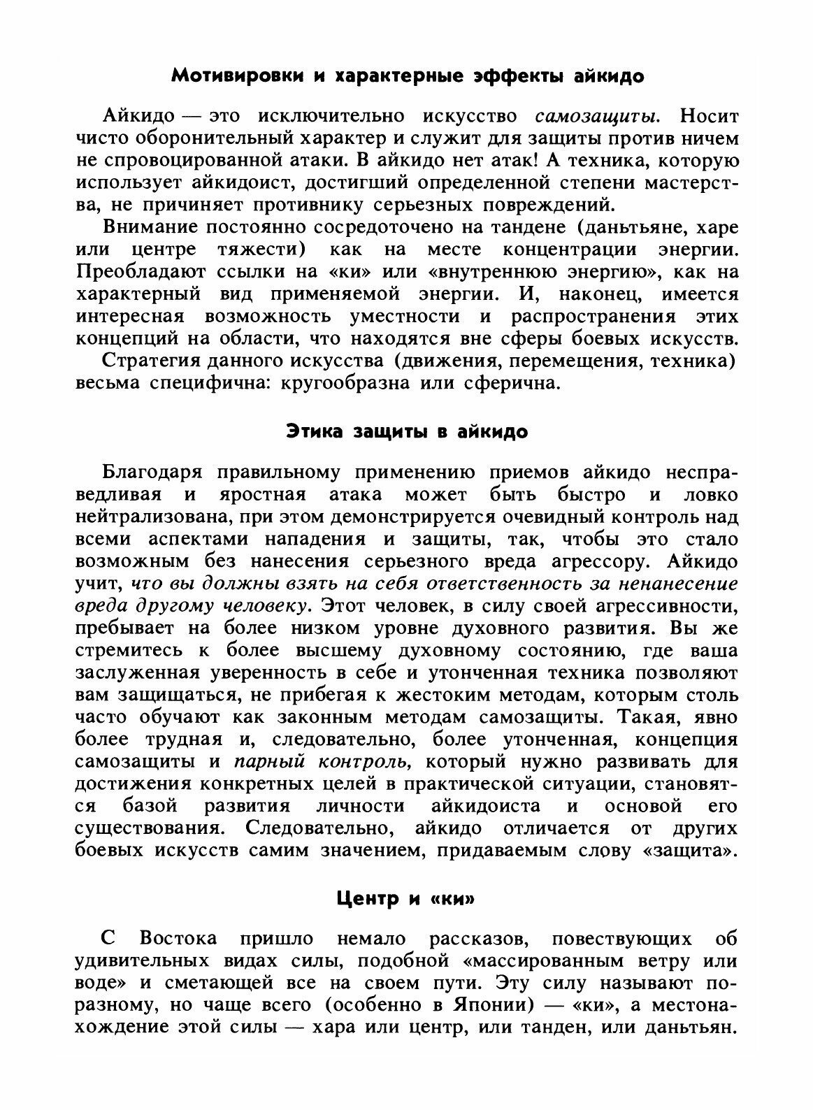 Правильное применение приемов айкидо может быстро и ловко погасить или отразить любую несправедливую и яростную атаку противника, при этом демонстрируя полный контроль над многими аспектами защиты и нападения, в результате оборона становится возможной без нанесения какого-либо серьезного вреда нападавшему.Айкидо учит, чтобы практикующий брал на себя ответственность за целостность своего соперника. Нападающий на вас человек из-за проявления агрессивности, находится на низком уровне духовного развития. Вашей же целью при практиковании айкидо является пребывание в состоянии более высокого духовного состояния, в котором ваше спокойствие, уверенность и изящная техника позволят защитить себя без жестких методов, которые очень широко обучают как приемам самозащиты в бою.Концепция самозащиты в айкидо является более трудной и более утонченной. Парный контроль, который практикуют в айкидо нужен для развития конкретных целей в практической ситуации, все это становится базовыми навыками в развитии личности бойца айкидоиста и основой его существования.Таким образом, стиль боевого искусства айкидо значительно отличается от других боевых искусств самим пониманием слова защита.