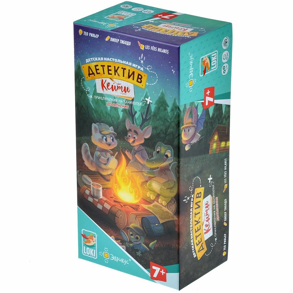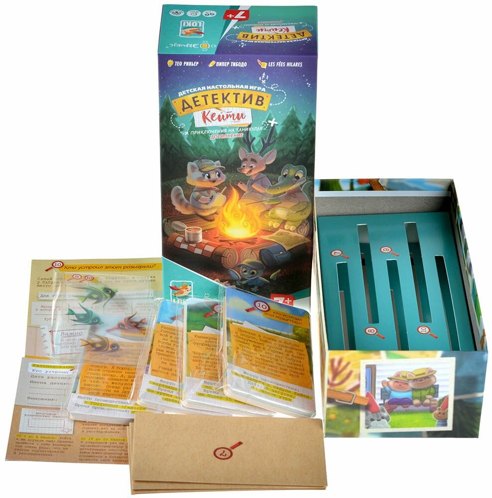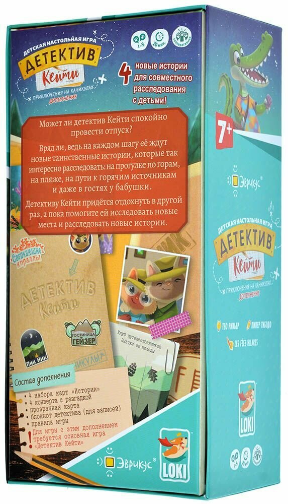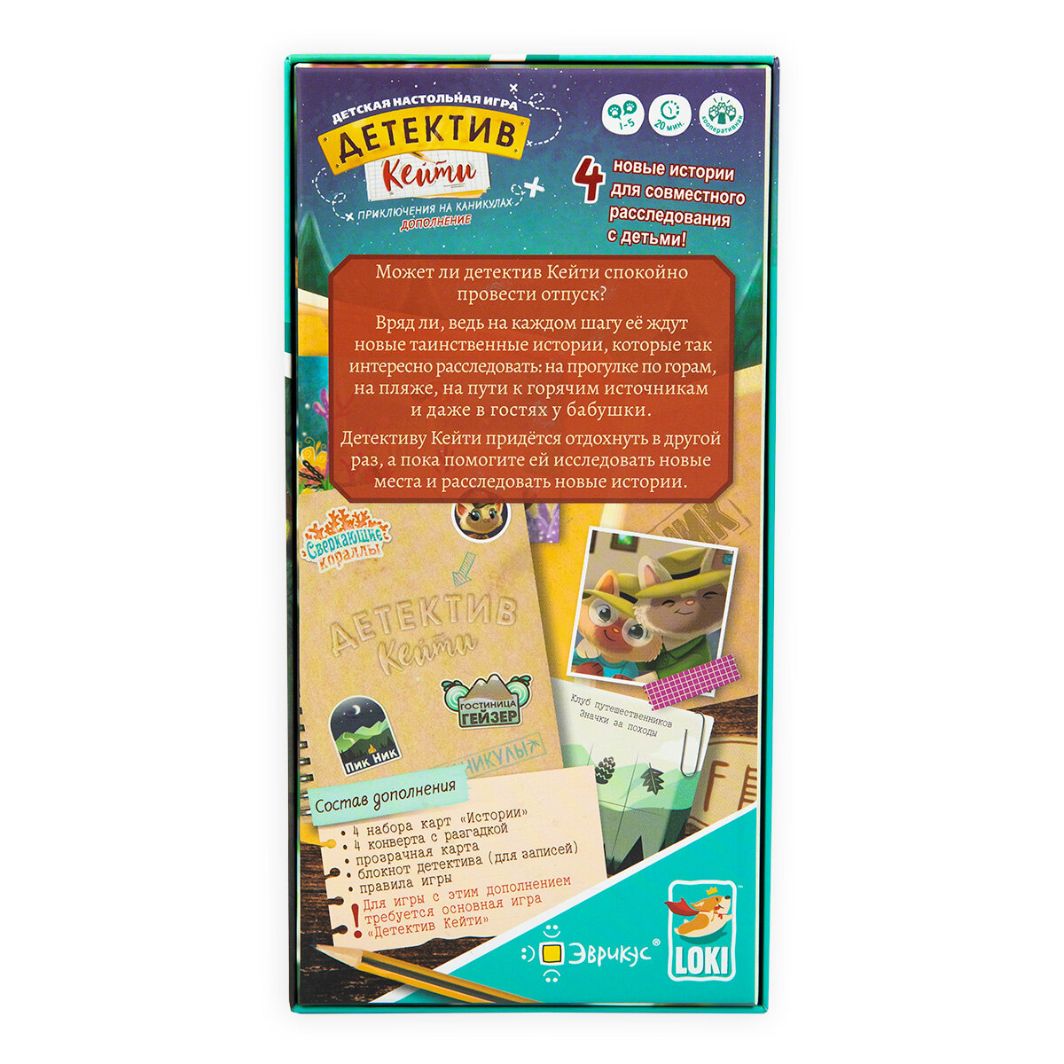 "Детектив Кейти: Приключения на каникулах" это дополнение к детективной настольной игре "Детектив Кейти" с 4 новыми расследованиями. Новые происшествия в дополнении сложнее, содержат элементы квестов, шифрования и логические загадки.