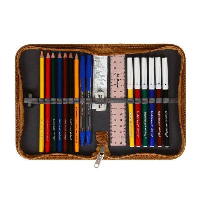 Наполнение (18 предметов): ручка шариковая, синие чернила: 2 шт., чернографитный карандаш HB: 1 шт., фломастеры: 6 цветов, цветные карандаши: 6 цветов, ластик: 1 шт., точилка: 1 шт., линейка пластиковая 15 см: 1 шт.