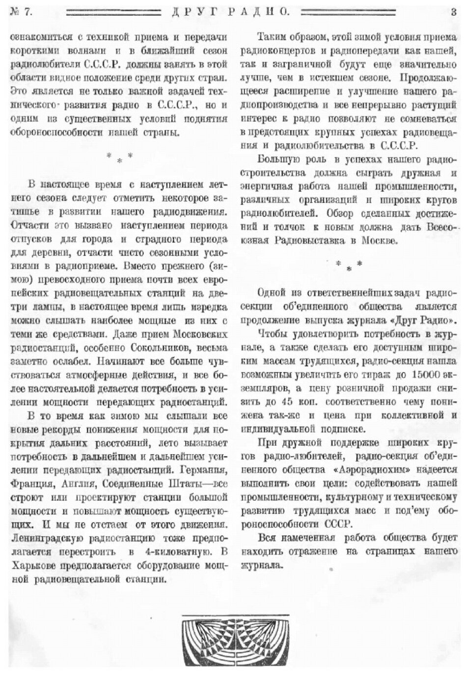 С ноября 1924 года в Ленинграде начал выходить ежемесячный журнал "Друг радио" - орган Общества друзей радио (ОДР) РСФСР и ОДР Северо-Западной области. В N 2 за 1924 год в нем дано определение двух типов радиолюбителей: "Наибольшая часть любителей, хотя и интересуется тайнами радио, т. е. сущностью радиопередачи и приема и устройством приборов, но главным образом стремится пользоваться чудесами радио, слушать речи, концерты. Это - любители радио. Меньшая часть друзей радио интересуется преимущественно научной и технической стороной дела, желает постигнуть тайны радио, чтобы самим научиться воспроизводить его чудеса - это настоящие радиолюбители".