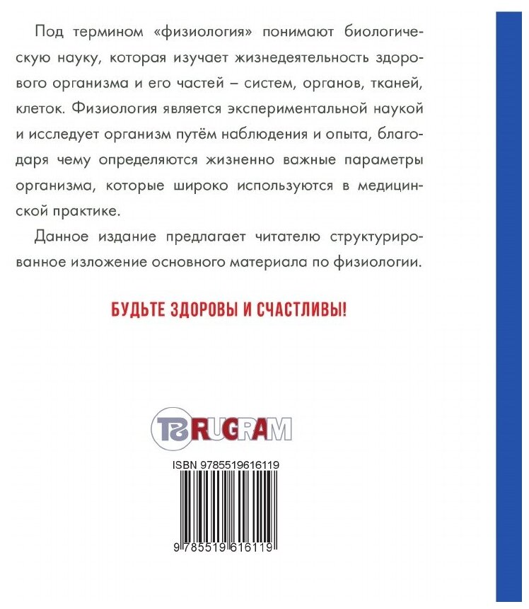 Под термином "физиология" понимают биологическую науку, которая изучает жизнедеятельность здорового организма и его частей - систем, органов, тканей, клеток. Физиология является экспериментальной наукой и исследует организм путём наблюдения и опыта, благодаря чему определяются жизненно важные параметры организма, которые широко используются в медицинской практике. Данное издание предлагает читателю структурированное изложение основного материала по физиологии.Издательство T8RUGRAMМягкий переплетОбъем - 336 стр.Формат - 148x210 мм.ISBN 978-5-519-61611-9Год издания: 2018