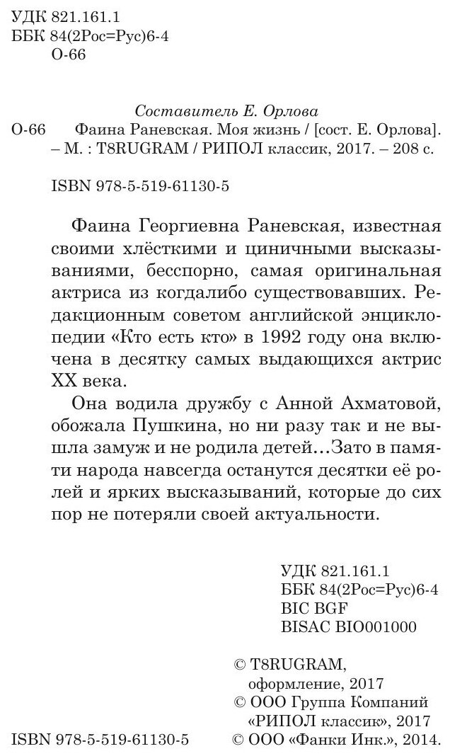 Книга Фаина Раневская Моя Жизнь (Орлова Елизавета), 2017
