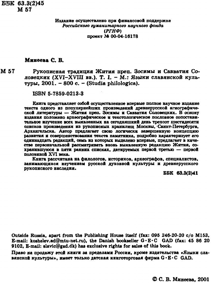 Книга представляет собой осуществленное впервые полное научное издание текста одного из популярнейших произведений древнерусской агиографической литературы - Жития преп. Зосимы и Савватия Соловецких. В основу издания положено археографическое и текстологическое пословное сопоставительное изучение всех выявленных на сегодняшний день трехсот шестидесяти списков произведения из рукописных хранилищ Москвы, Санкт-Петербурга, Архангельска. Автор предлагает свою логически завершенную концепцию развития и совершенствования текста памятника, подробно характеризует его одиннадцать редакций, семь из которых выделено впервые, предлагает в качестве первоначальной рассматривать вновь выявленную редакцию Жития, сохранившуюся в пяти ранних списках, датируемых первой третью - первой половиной ХVI века.Книга рассчитана на филологов, историков, археографов, специалистов, занимающихся изучением русской духовной культуры и древнерусского рукописного наследия.