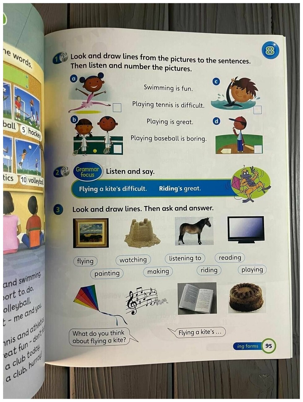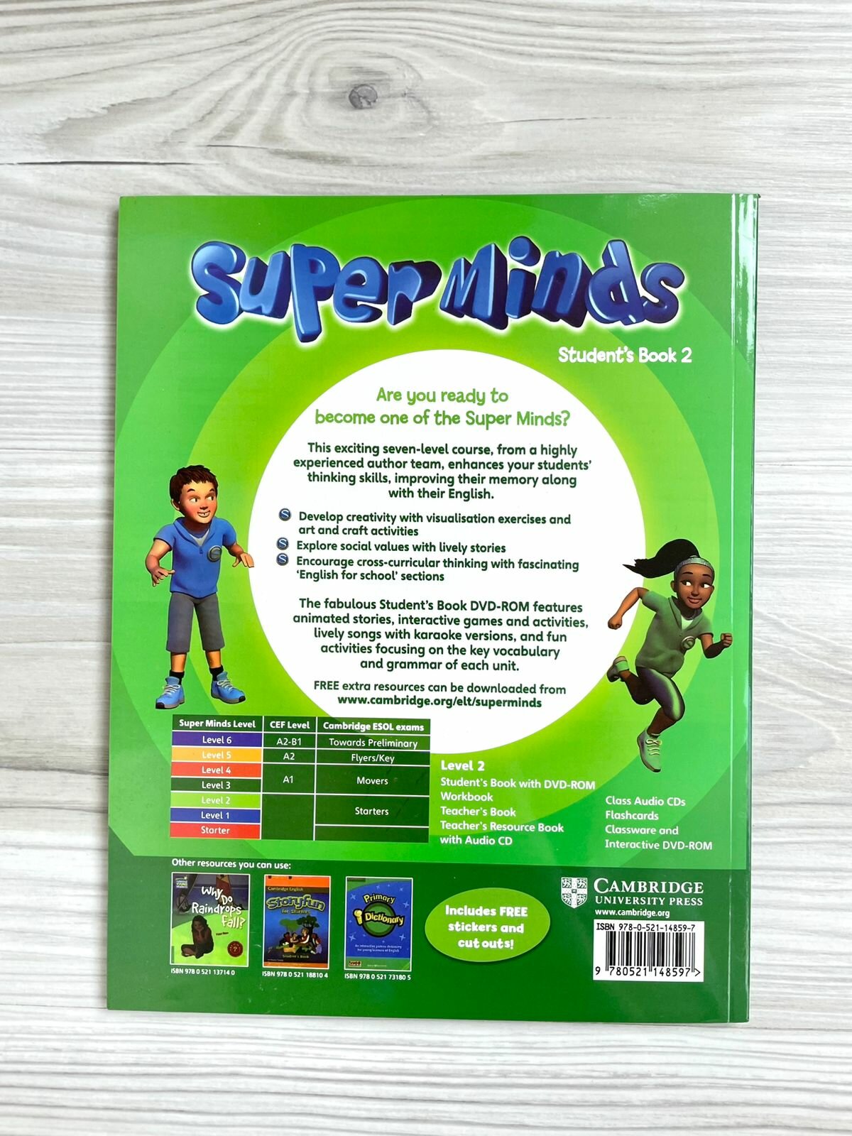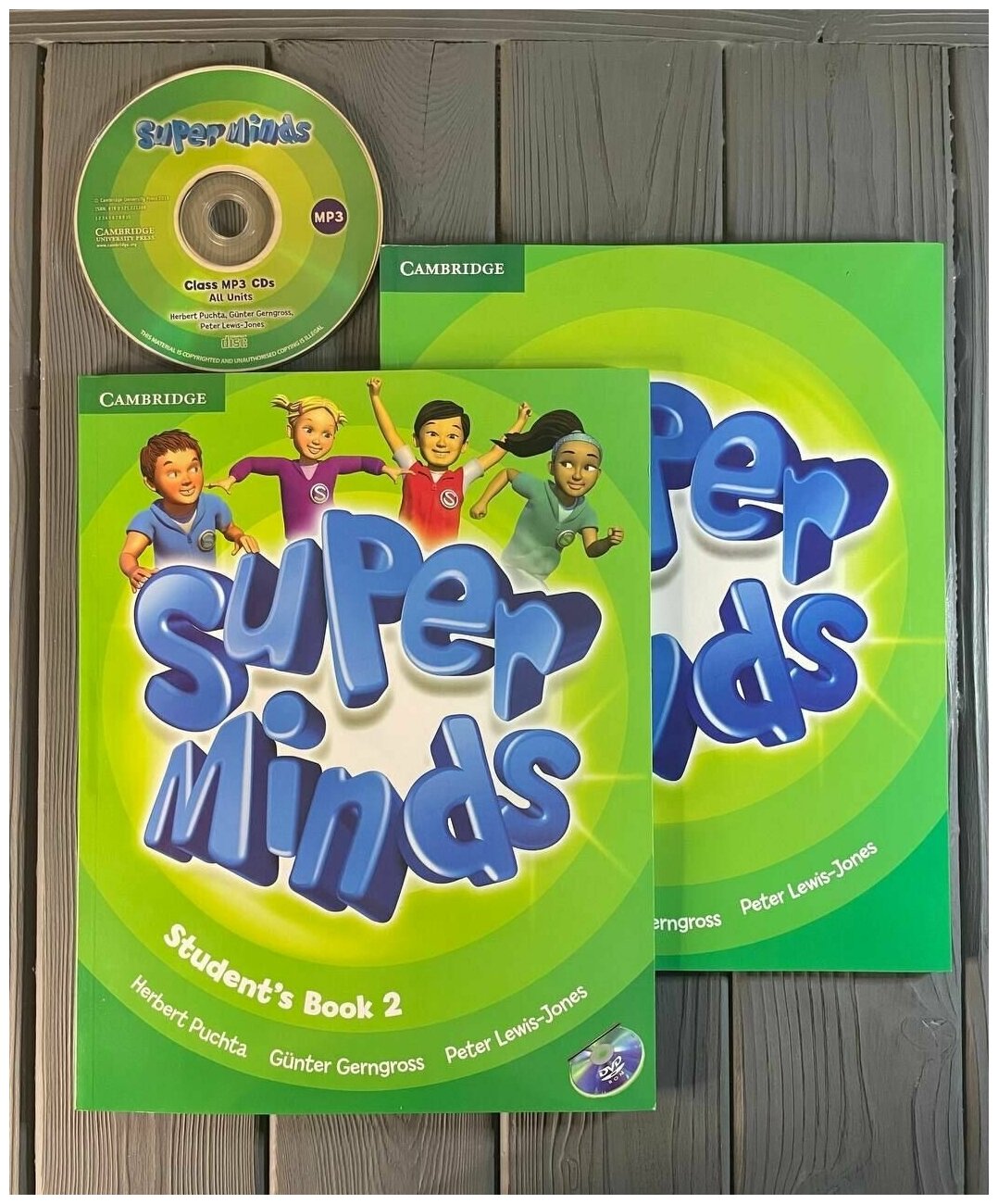 Учебник Super Minds 2 содержит: лексика: продолжается изучение тем о школе, еде, животных, частях тела, вводятся новые темы о повседневных делах, местах в городе, спорте, праздниках, обустройстве дома. грамматика: структуры «Is there any, Are there any», «Would you like», «He likes, He doesn’t like», «I’d like», «Can I/ We», притяжательные местоимения, предлоги местоположения, Present Continuous. типы заданий: повторение в конце каждого урока на базе межпредметных связей, заполнение пропусков в тексте, логико-математическое мышление, отбор информации, сравнение, классификация, прогнозирование и проверка, анализ и определение причины; наклейки и рисунки для вырезания; DVD-ROM диск: видео, игры, песни с караоке.