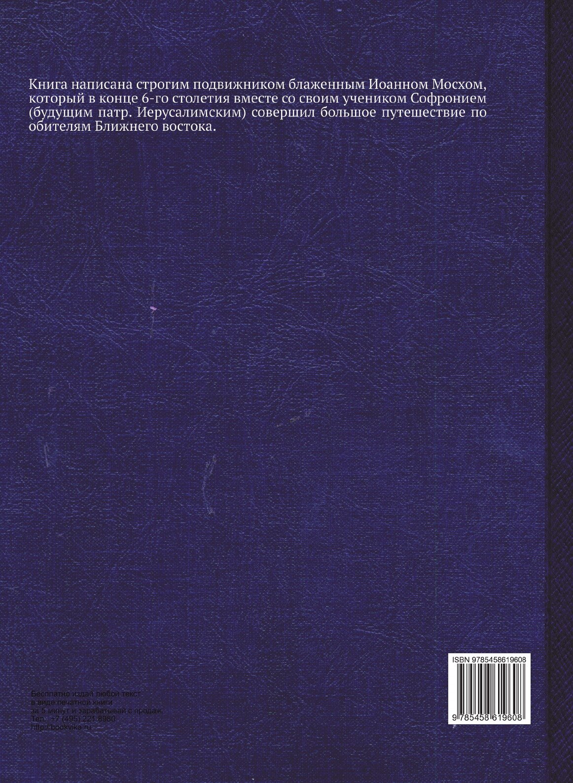 Книга написана строгим подвижником блаженным Иоанном Мосхом, который в конце 6-го столетия вместе со своим учеником Софронием (будущим патр. Иерусалимским) совершил большое путешествие по обителям Ближнего востока. Воспроизведено в оригинальной авторской орфографии издания 1628 года (издательство "Киев").