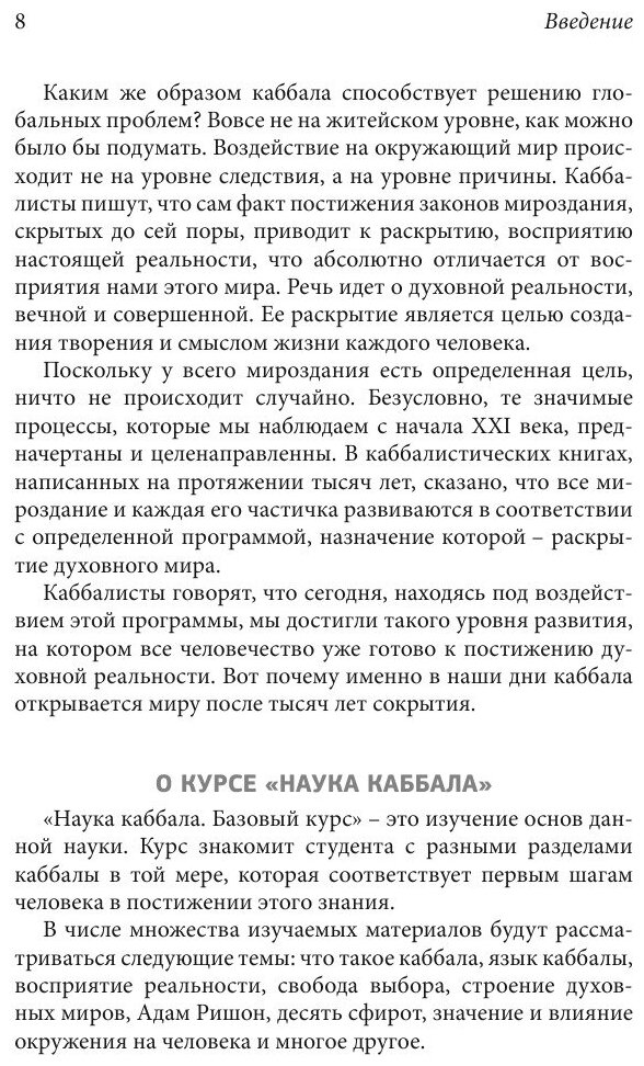 Поскольку у всего мироздания есть определенная цель, ничто не происходит случайно. В каббалистических книгах, написанных на протяжении тысяч лет, сказано, что все мироздание и каждая его частичка развиваются в соответствии с определенной про-граммой, назначение которой - раскрытие духовного мира.Наука каббала. Базовый курс - это изучение основ науки каб-бала. В первую очередь задача курса - представить науку каббала в качестве практического метода, помогающего каждому человеку достичь равновесия с окружающим его миром. В результате жизнь людей может стать счастливой, наполненной уверенностью и со-вершенством.