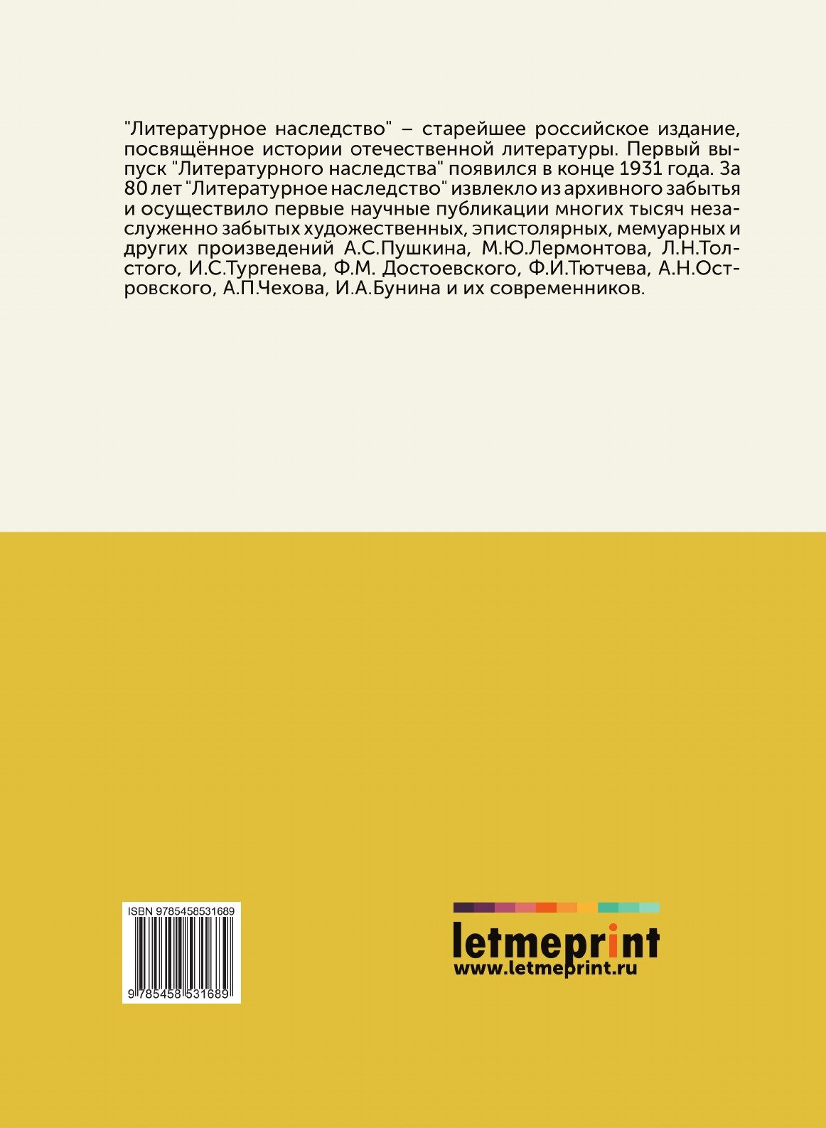 Книга "Литературное наследство. Выпуск 9–10".Эта книга — репринт оригинального издания (издательство "Журнально-газетное объединение", 1933 год), созданный на основе электронной копии высокого разрешения, которую очистили и обработали вручную, сохранив структуру и орфографию оригинального издания. Редкие, забытые и малоизвестные книги, изданные с петровских времен до наших дней, вновь доступны в виде печатных книг."Литературное наследство" – старейшее российское издание, посвящённое истории отечественной литературы. Первый выпуск "Литературного наследства" появился в конце 1931 года. За 80 лет "Литературное наследство" извлекло из архивного забытья и осуществило первые научные публикации многих тысяч незаслуженно забытых художественных, эпистолярных, мемуарных и других произведений А.С.Пушкина, М.Ю.Лермонтова, Л.Н.Толстого, И.С.Тургенева, Ф.М. Достоевского, Ф.И.Тютчева, А.Н.Островского, А.П.Чехова, И.А.Бунина и их современников.