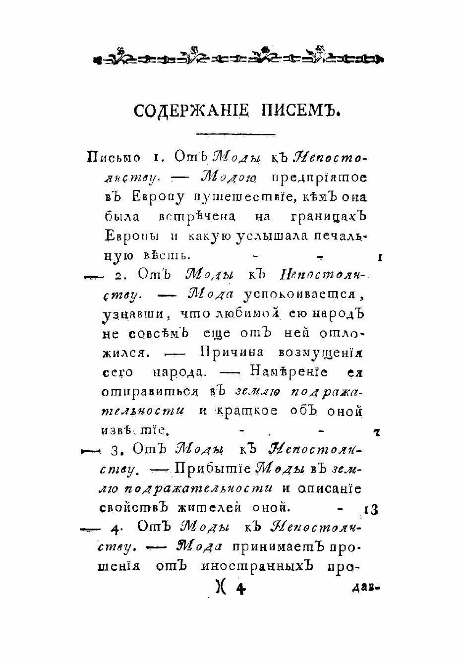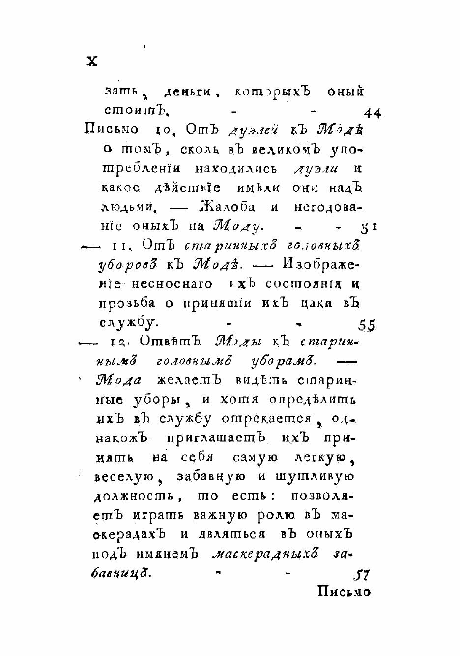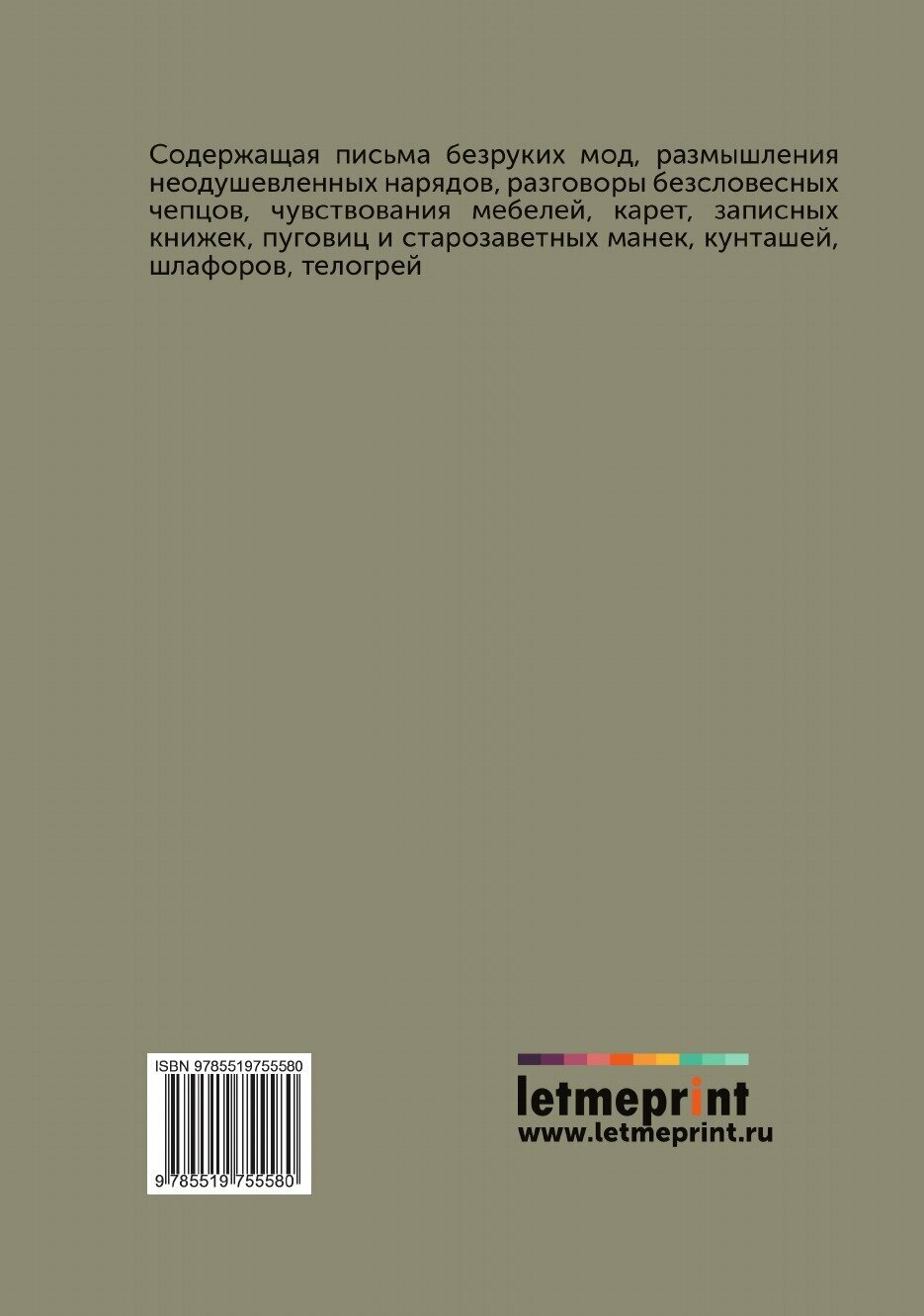 Содержащая письма безруких мод, размышления неодушевленных нарядов, разговоры безсловесных чепцов, чувствования мебелей, карет, записных книжек, пуговиц и старозаветных манек, кунташей, шлафоров, телогрей
