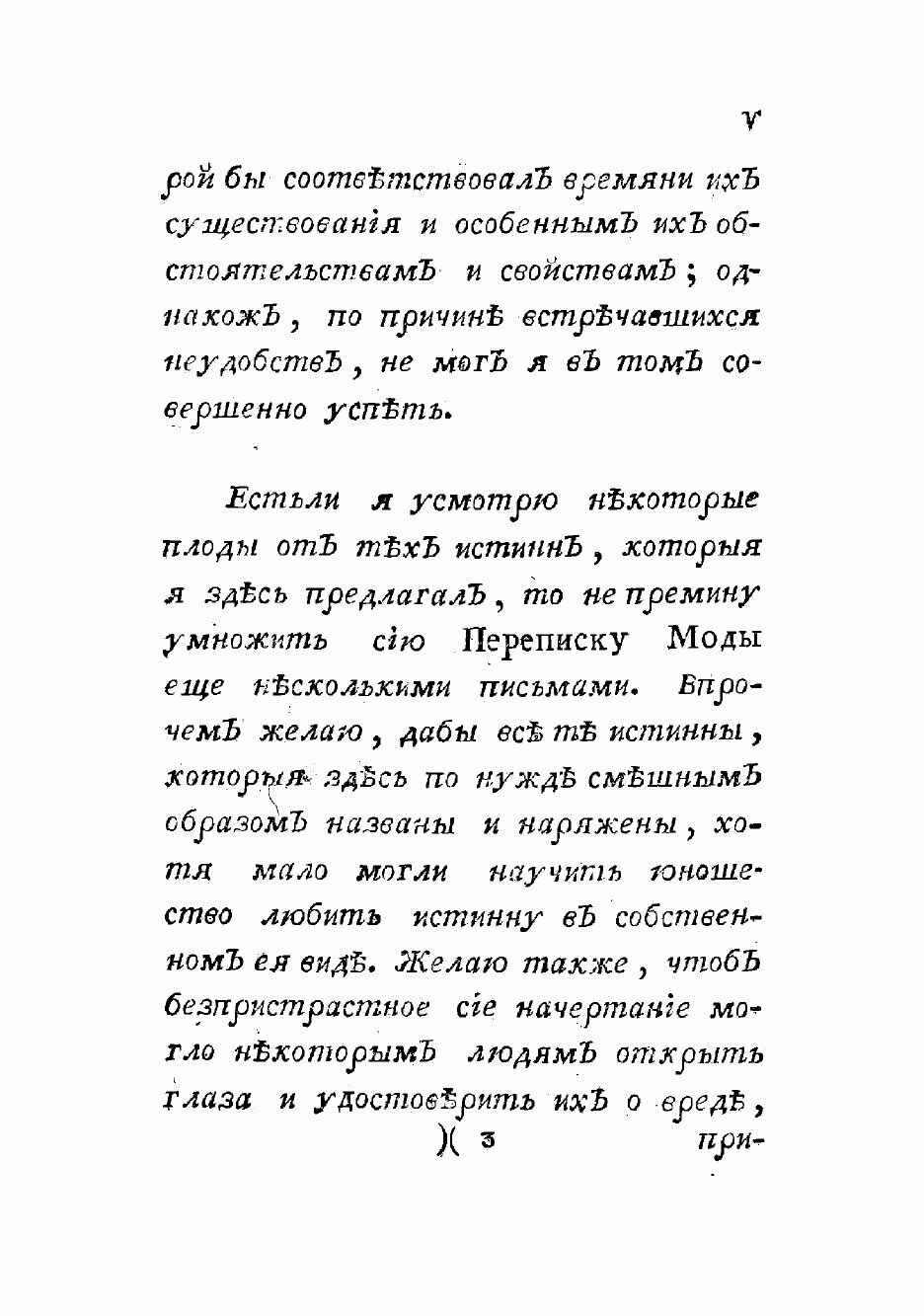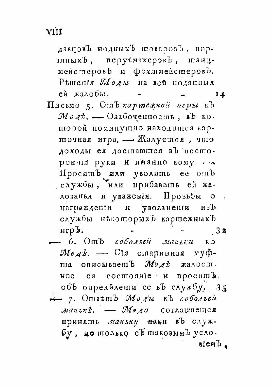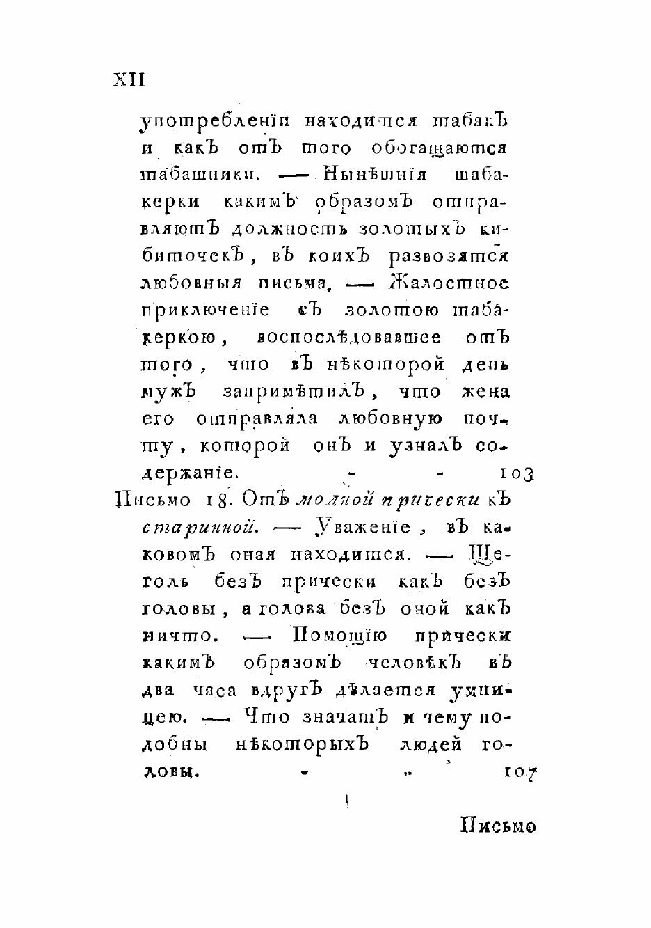 Содержащая письма безруких мод, размышления неодушевленных нарядов, разговоры безсловесных чепцов, чувствования мебелей, карет, записных книжек, пуговиц и старозаветных манек, кунташей, шлафоров, телогрей