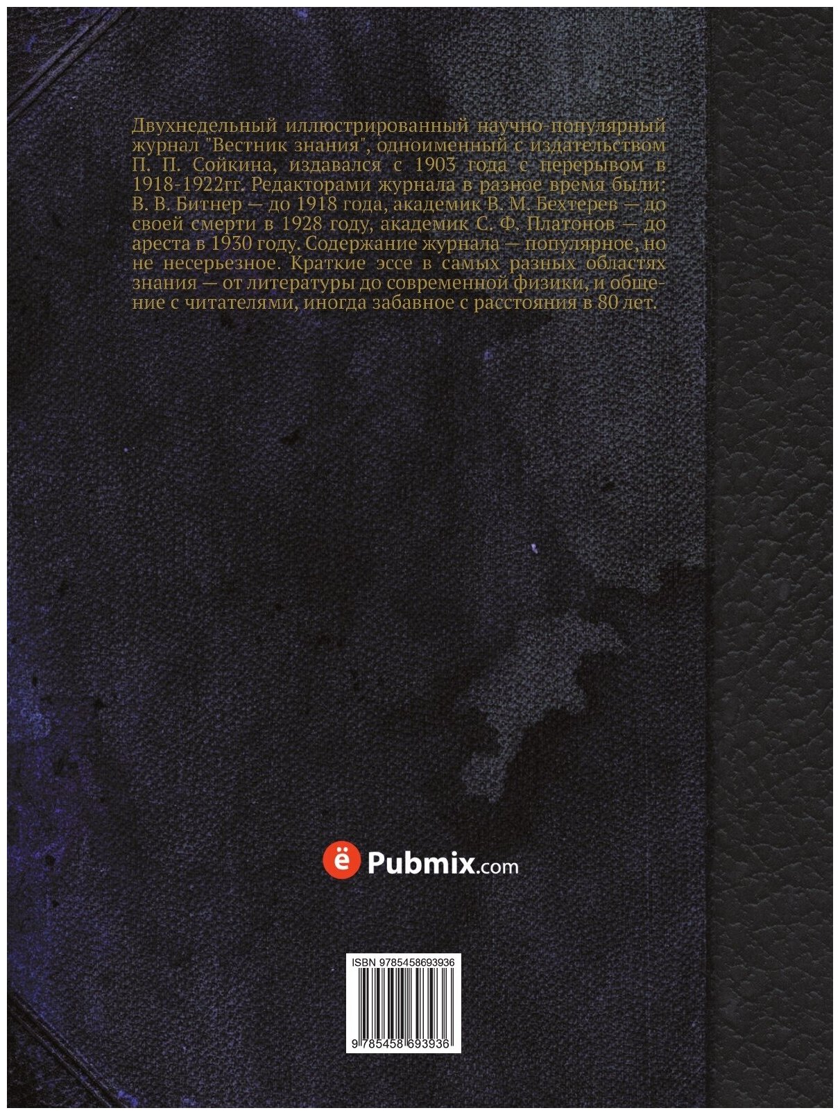Двухнедельный иллюстрированный научно-популярный журнал "Вестник знания", одноименный с издательством П. П. Сойкина, издавался с 1903 года с перерывом в 1918-1922гг. Редакторами журнала в разное время были: В. В. Битнер — до 1918 года, академик В. М. Бехтерев — до своей смерти в 1928 году, академик С. Ф. Платонов — до ареста в 1930 году. Содержание журнала — популярное, но не несерьезное. Краткие эссе в самых разных областях знания — от литературы до современной физики, и общение с читателями, иногда забавное с расстояния в 80 лет.