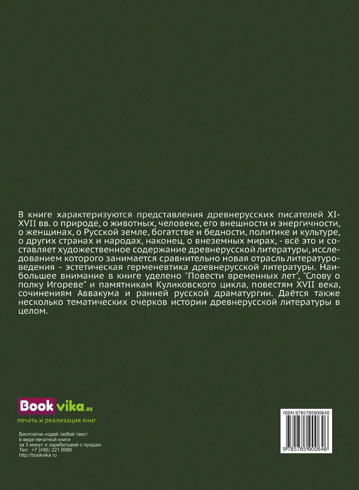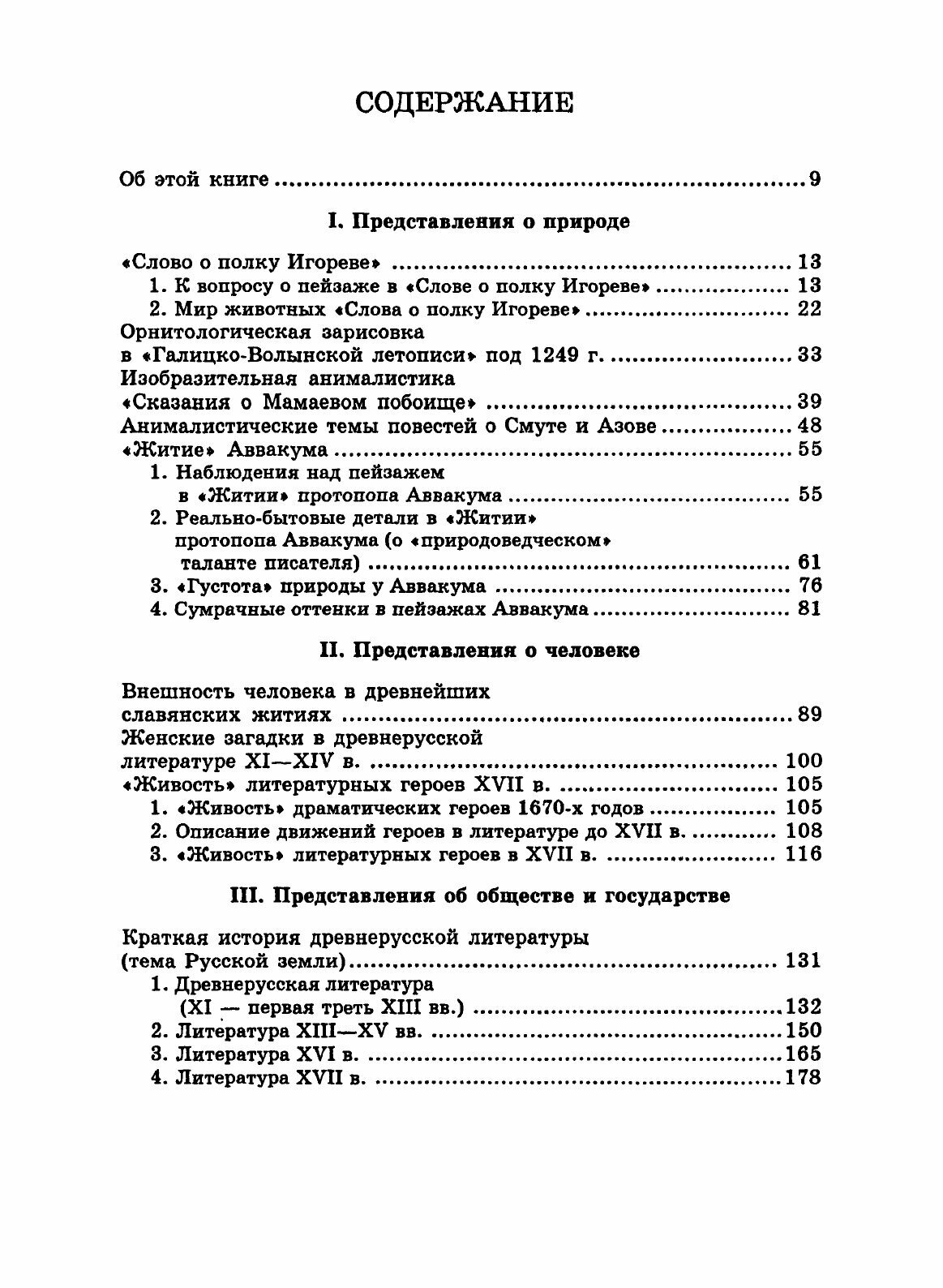 В книге характеризуются представления древнерусских писателей XI-XVII вв. о природе, о животных, человеке, его внешности и энергичности, о женщинах, о Русской земле, богатстве и бедности, политике и культуре, о других странах и народах, наконец, о внеземных мирах, - всё это и составляет художественное содержание древнерусской литературы, исследованием которого занимается сравнительно новая отрасль литературоведения - эстетическая герменевтика древнерусской литературы. Наибольшее внимание в книге уделено "Повести временных лет", "Слову о полку Игореве" и памятникам Куликовского цикла, повестям XVII века, сочинениям Аввакума и ранней русской драматургии. Даётся также несколько тематических очерков истории древнерусской литературы в целом.