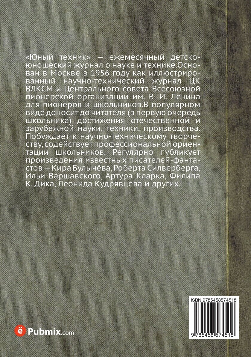 «Юный техник» — ежемесячный детско-юношеский журнал о науке и технике.Основан в Москве в 1956 году как иллюстрированный научно-технический журнал ЦК ВЛКСМ и Центрального совета Всесоюзной пионерской организации им. В. И. Ленина для пионеров и школьников.В популярном виде доносит до читателя (в первую очередь школьника) достижения отечественной и зарубежной науки, техники, производства. Побуждает к научно-техническому творчеству, содействует профессиональной ориентации школьников. Регулярно публикует произведения известных писателей-фантастов — Кира Булычёва, Роберта Силверберга, Ильи Варшавского, Артура Кларка, Филипа К. Дика, Леонида Кудрявцева и других.