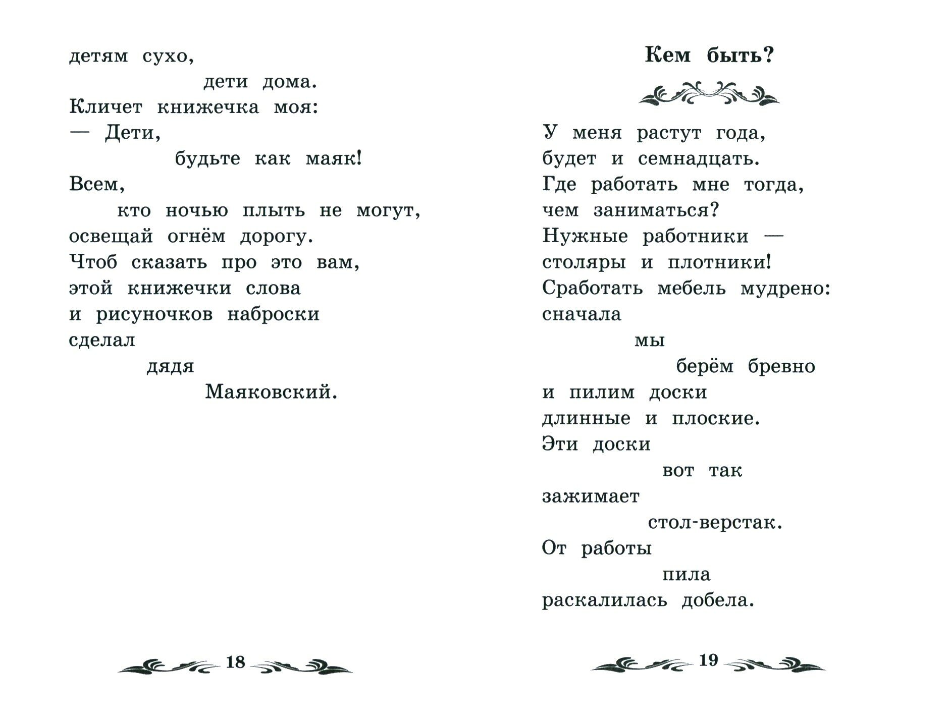 Владимир Владимирович Маяковский (1893-1930) родился в селе Багдади, недалеко от города Кутаиси, в обедневшей дворянской семье. В 1902 году, после смерти отца, Маяковский с матерью и сестрами переехал в Москву. Это оказало значительное влияние на будущего поэта. Здесь, немного повзрослев, он познакомится со студентами-революционерами и будет принимать активное участие в революционной деятельности. К поэзии Маяковский приходит не сразу - в 1911 году он поступает в Училище живописи, ваяния и зодчества, откуда его исключили через три года за публичные выступления. Впервые стихотворения Маяковского были опубликованы в 1912 году в сборнике поэтов-футуристов "Пощёчина общественному вкусу". Маяковский был очень яркой и харизматичной личностью, свободолюбие и оригинальность нашли отражение и в его творчестве. Поэт установил свои собственные законы стихосложения, он создавал свои образы и метафоры, рифмы, ритм и размер стиха, придумывал новые слова (жирафка, зверики, дрыгоножество, испавлиниться и др.) и даже записывал свои стихи по-особенному - не в столбик, а "лесенкой". Тематика поэзии Маяковского разнообразна: это и лирические стихотворения, и сатира, и гражданская лирика. Не менее важным поэт считал творчество для детей: "Моё последнее увлечение - детская литература. Надо дать детям новые представления и новые понятия об окружающих вещах". Маяковский увлекает своих юных читателей с первых строк - такие яркие и примечательные образы он создает в своих произведениях для детей. Это и поучительные истории ("Что такое хорошо и что такое плохо?", "История Власа, лентяя и лоботряса") и рассказы о дальних странах ("Это книжечка моя про моря и про маяк"), и необычное путешествие по зоопарку ("Что ни страница - то слон, то львица"), и путеводитель по профессиям ("Кем быть?"), и увлекательное описание, как изготовляются игрушки, сколько людей разных профессий принимают в этом участие ("Конь-огонь"). Большинство своих детских книг Маяковский иллюстрировал сам. Для младшего школьного возраста. Текст произведений приводится без сокращений.