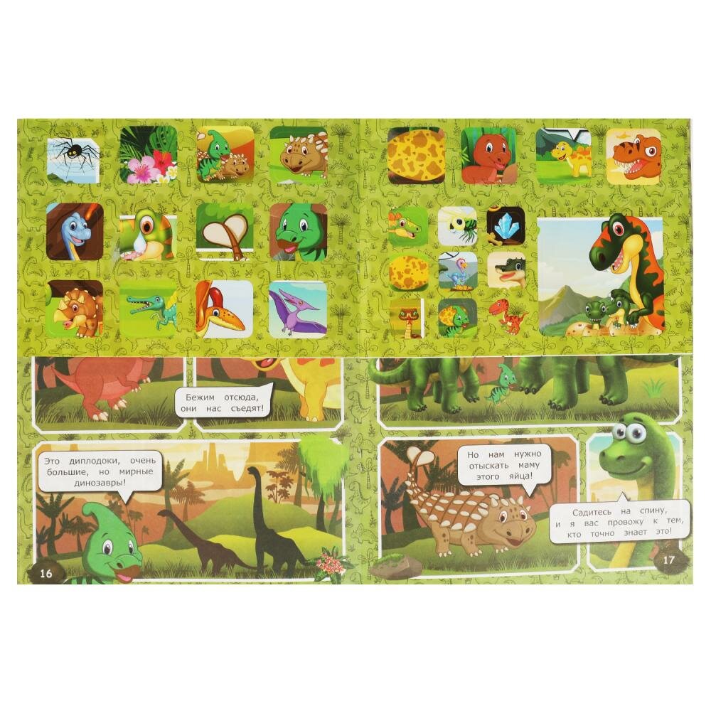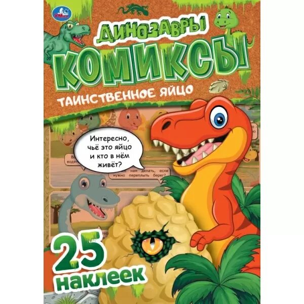 Комиксы с наклейками «Динозавры. Таинственное яйцо» ТМ «УМка» станет прекрасным подарком для маленьких любознаек: 25 ярких наклеек, интересный сюжет, много красочных иллюстраций, удобный большой формат Эти увлекательные комиксы, состоящие практически из одних картинок с минимальным количеством текста, приглашают детей окунуться в удивительный мир, где живут милые и забавные динозавры. Такой формат непременно заинтересует ребёнка, он с удовольствием будет читать необыкновенную историю, оформленную яркими иллюстрациями, и наклеивать яркие стикеры. Рекомендовано детям младшего школьного возраста.