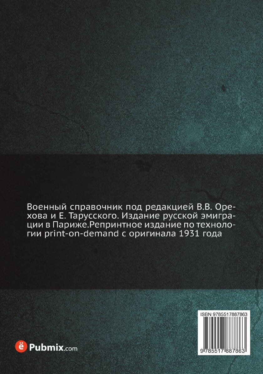 Эта книга — репринт оригинального издания (издательство "Издательство "Часовой"", 1931 год), созданный на основе электронной копии высокого разрешения, которую очистили и обработали вручную, сохранив структуру и орфографию оригинального издания. Редкие, забытые и малоизвестные книги, изданные с петровских времен до наших дней, вновь доступны в виде печатных книг._x000D_ _x000D_ Военный справочник под редакцией В.В. Орехова и Е. Тарусского. Издание русской эмиграции в Париже.Репринтное издание по технологии print-on-demand с оригинала 1931 года