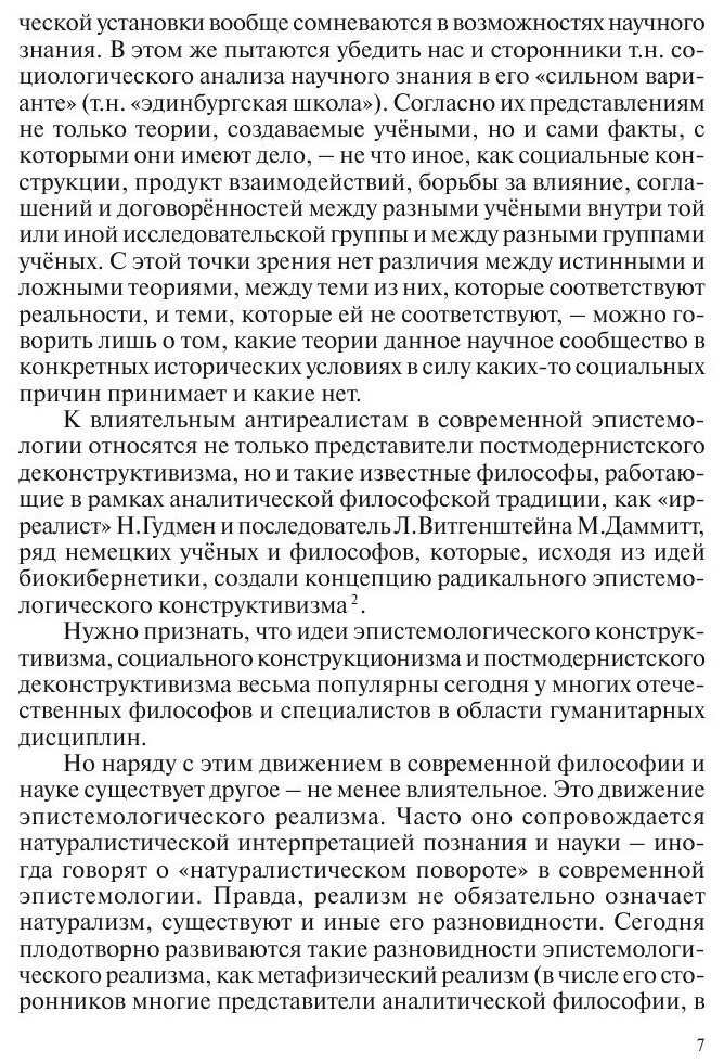 Работа посвящена ряду актуальных теоретико-познавательных проблем, характерных для современной эпистемологической ситуации. Основное внимание уделяется дискуссии между реализмом и антиреализмом по поводу фундаментальных оснований наук о природе, обществе и особенно о человеке. Обосновывается продуктивность и перспективность конструктивного реализма. Освещаются проблемы объективности знания, релятивизма, а также ценностные аспекты познания. Книга рассчитана на всех, интересующихся современными проблемами теории познания.