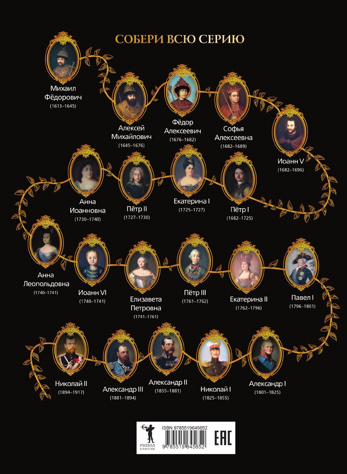 В серии "Русские государи. Романовы" представлены книги, посвященные представителям царской династии, правящей Россией с конца XVI до начала XX века. От Михаила Фёдоровича до Николая II - соберите все книги о монархах дома Романовых, творивших историю России на протяжении более трехсот лет.