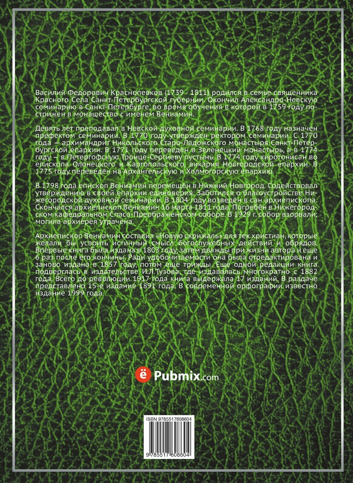 Эта книга - репринт оригинального издания (издательство "книгопродавца И. Л. Тузова", 1908 год), созданный на основе электронной копии высокого разрешения, которую очистили и обработали вручную, сохранив структуру и орфографию оригинального издания. Редкие, забытые и малоизвестные книги, изданные с петровских времен до наших дней, вновь доступны в виде печатных книг.Василий Федорович Краснопевков (1739 - 1811) родился в семье священника Красного Cела Санкт-Петербургской губернии. Окончил Александро-Невскую семинарию в Санкт-Петербурге, во время обучения в которой в 1759 году пострижен в монашество с именем Вениамин.Девять лет преподавал в Невской духовной семинарии. В 1768 году назначен префектом семинарии. В 1770 году утвержден ректором семинарии. С 1770 года - архимандрит Никольского Старо-Ладожского монастыря Санкт-Петербургской епархии. В 1771 году переведён в Зеленецкий монастырь, а в 1774 году - в Петергофскую Троице-Сергиеву пустынь. В 1774 году хиротонисан во епископа Олонецкого и Каргопольского, викария Новгородской епархии. В 1775 году переведён на Архангельскую и Холмогорскую епархию.В 1798 года епископ Вениамин перемещён в Нижний Новгород. Содействовал утверждению в своей епархии единоверия. Заботился о благоустройстве Нижегородской духовной семинарии. В 1804 году возведён в сан архиепископа.Скончался архиепископ Вениамин 16 марта 1811 года. Погребён в Нижегородском кафедральном Спасо-Преображенском соборе. В 1929 г. собор взорвали; могила архиерея утрачена.Архиепископ Вениамин составил "Новую скрижаль" для тех христиан, которые желали бы усвоить истинный смысл богослужебных действий и обрядов. Впервые книга была издана в 1803 году, затем дважды при жизни автора и еще 6 раз после его кончины. Ради удобочитаемости она была отредактирована и заново издана в 1857 году, потом еще трижды. Еще одной редакции книга подверглась в издательстве И. Л. Тузова, где издавалась многократно с 1882 года. Всего до революции 1917 года книга выдержала 17 изданий. В раздаче представлено 15-е издание 1891 года. В современной орфографии известно издание 1999 года.Издательство ЁЁ МедиаМягкий переплетОбъем - 309 стр.Формат - 210x280 мм.ISBN 978-5-517-60860-4Год издания: 2013
