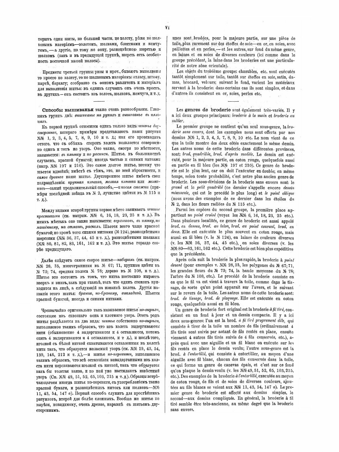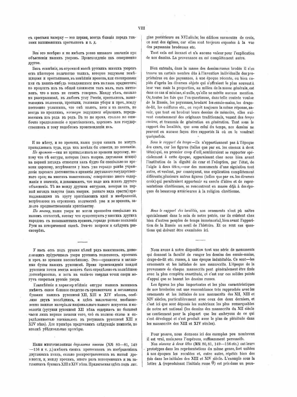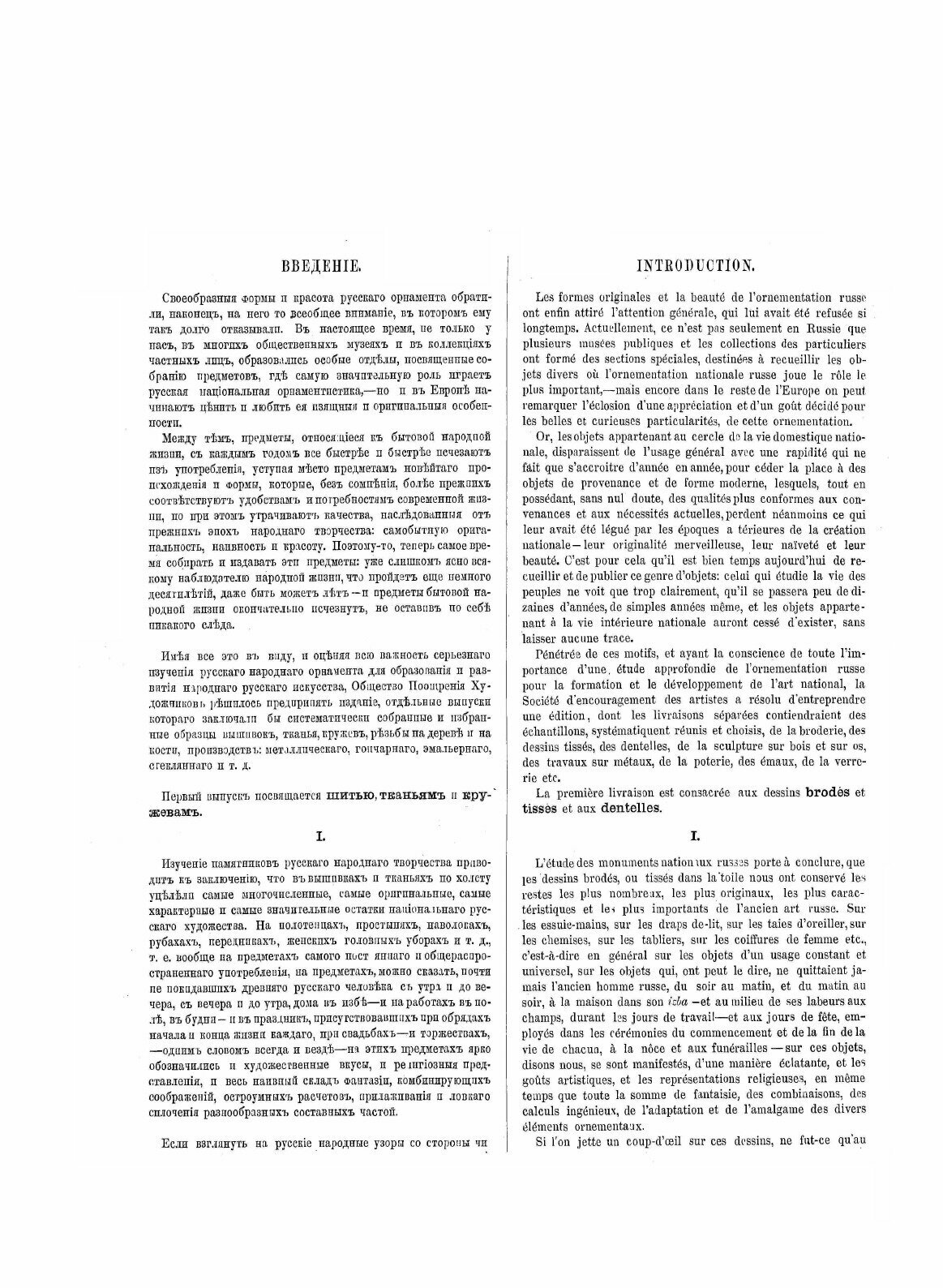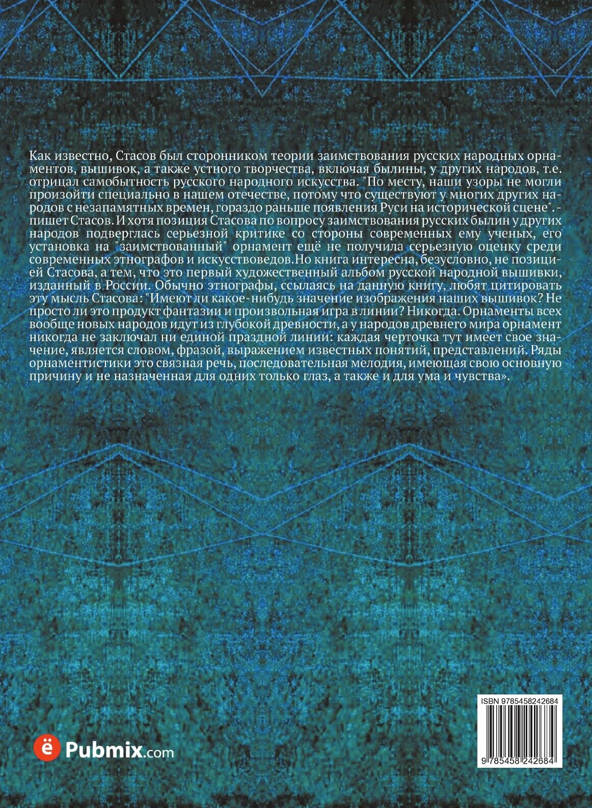 Как известно, Стасов был сторонником теории заимствования русских народных орнаментов, вышивок, а также устного творчества, включая былины, у других народов, т.е. отрицал самобытность русского народного искусства. "По месту, наши узоры не могли произойти специально в нашем отечестве, потому что существуют у многих других народов с незапамятных времен, гораздо раньше появления Руси на исторической сцене". - пишет Стасов. И хотя позиция Стасова по вопросу заимствования русских былин у других народов подверглась серьезной критике со стороны современных ему ученых, его установка на "заимствованный" орнамент ещё не получила серьезную оценку среди современных этнографов и искусствоведов.Но книга интересна, безусловно, не позицией Стасова, а тем, что это первый художественный альбом русской народной вышивки, изданный в России. Обычно этнографы, ссылаясь на данную книгу, любят цитировать эту мысль Стасова: "Имеют ли какое-нибудь значение изображения наших вышивок? Не просто ли это продукт фантазии и произвольная игра в линии? Никогда. Орнаменты всех вообще новых народов идут из глубокой древности, а у народов древнего мира орнамент никогда не заключал ни единой праздной линии: каждая черточка тут имеет свое значение, является словом, фразой, выражением известных понятий, представлений. Ряды орнаментистики это связная речь, последовательная мелодия, имеющая свою основную причину и не назначенная для одних только глаз, а также и для ума и чувства».