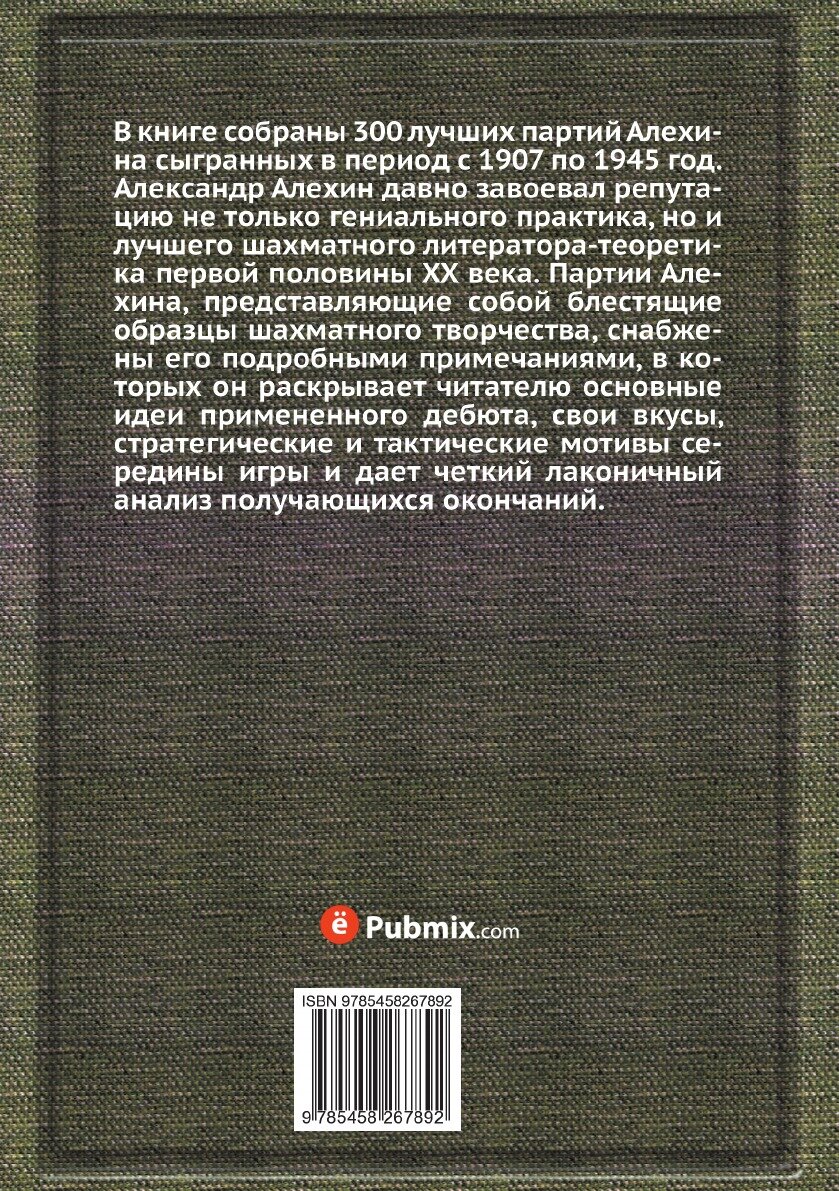 В книге собраны 300 лучших партий Алехина сыгранных в период с 1907 по 1945 год. Александр Алехин давно завоевал репутацию не только гениального практика, но и лучшего шахматного литератора-теоретика первой половины XX века. Партии Алехина, представляющие собой блестящие образцы шахматного творчества, снабжены его подробными примечаниями, в которых он раскрывает читателю основные идеи примененного дебюта, свои вкусы, стратегические и тактические мотивы середины игры и дает четкий лаконичный анализ получающихся окончаний.