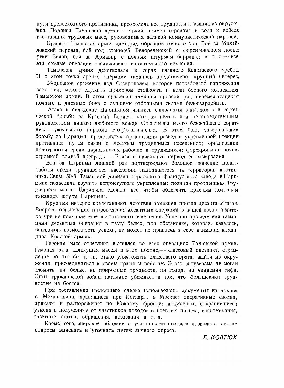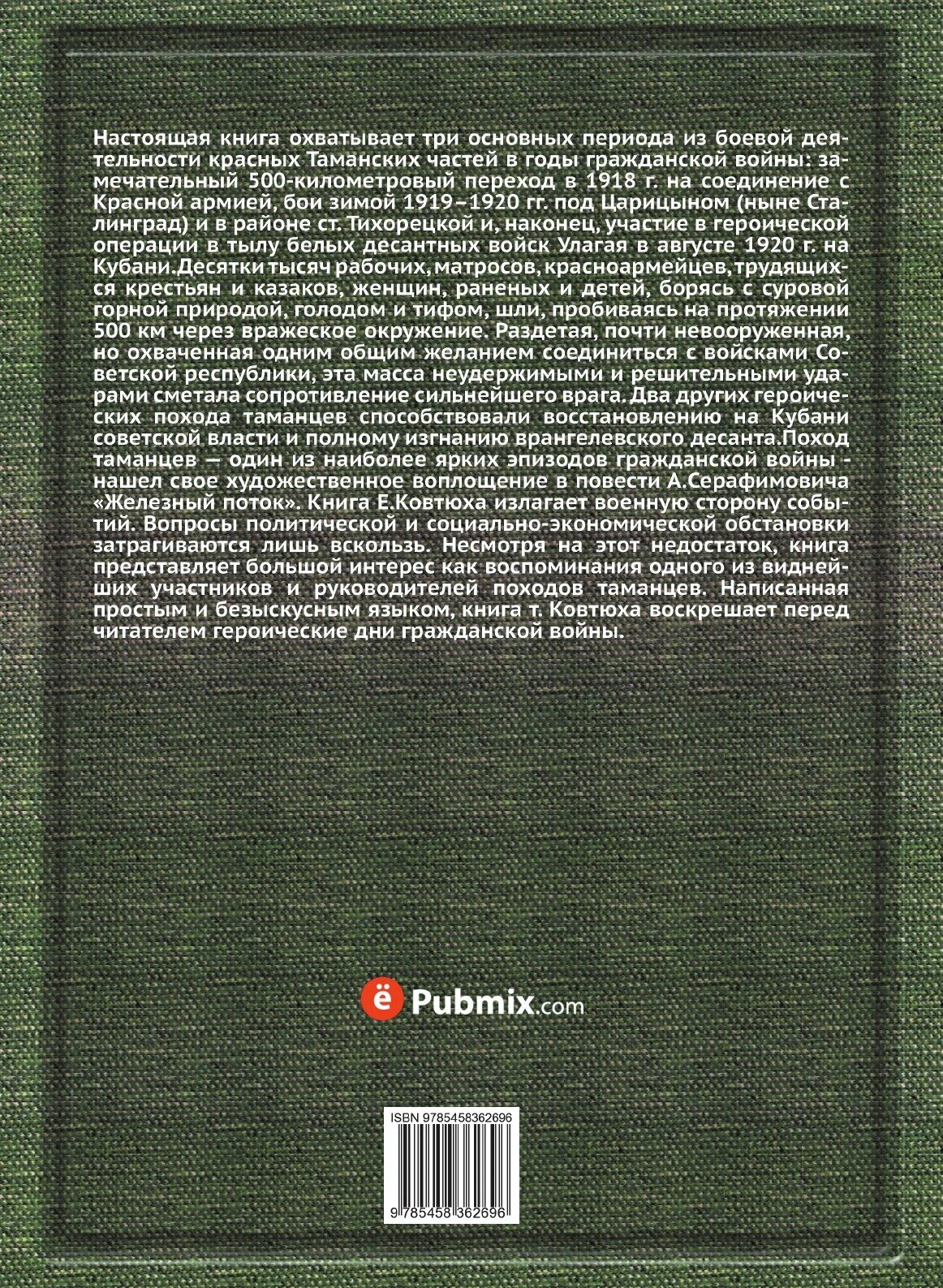 Настоящая книга охватывает три основных периода из боевой деятельности красных Таманских частей в годы гражданской войны: замечательный 500-километровый переход в 1918 г. на соединение с Красной армией, бои зимой 1919–1920 гг. под Царицыном (ныне Сталинград) и в районе ст. Тихорецкой и, наконец, участие в героической операции в тылу белых десантных войск Улагая в августе 1920 г. на Кубани.Десятки тысяч рабочих, матросов, красноармейцев, трудящихся крестьян и казаков, женщин, раненых и детей, борясь с суровой горной природой, голодом и тифом, шли, пробиваясь на протяжении 500 км через вражеское окружение. Раздетая, почти невооруженная, но охваченная одним общим желанием соединиться с войсками Советской республики, эта масса неудержимыми и решительными ударами сметала сопротивление сильнейшего врага. Два других героических похода таманцев способствовали восстановлению на Кубани советской власти и полному изгнанию врангелевского десанта.Поход таманцев — один из наиболее ярких эпизодов гражданской войны - нашел свое художественное воплощение в повести А.Серафимовича «Железный поток». Книга Е.Ковтюха излагает военную сторону событий. Вопросы политической и социально-экономической обстановки затрагиваются лишь вскользь. Несмотря на этот недостаток, книга представляет большой интерес как воспоминания одного из виднейших участников и руководителей походов таманцев. Написанная простым и безыскусным языком, книга т. Ковтюха воскрешает перед читателем героические дни гражданской войны.