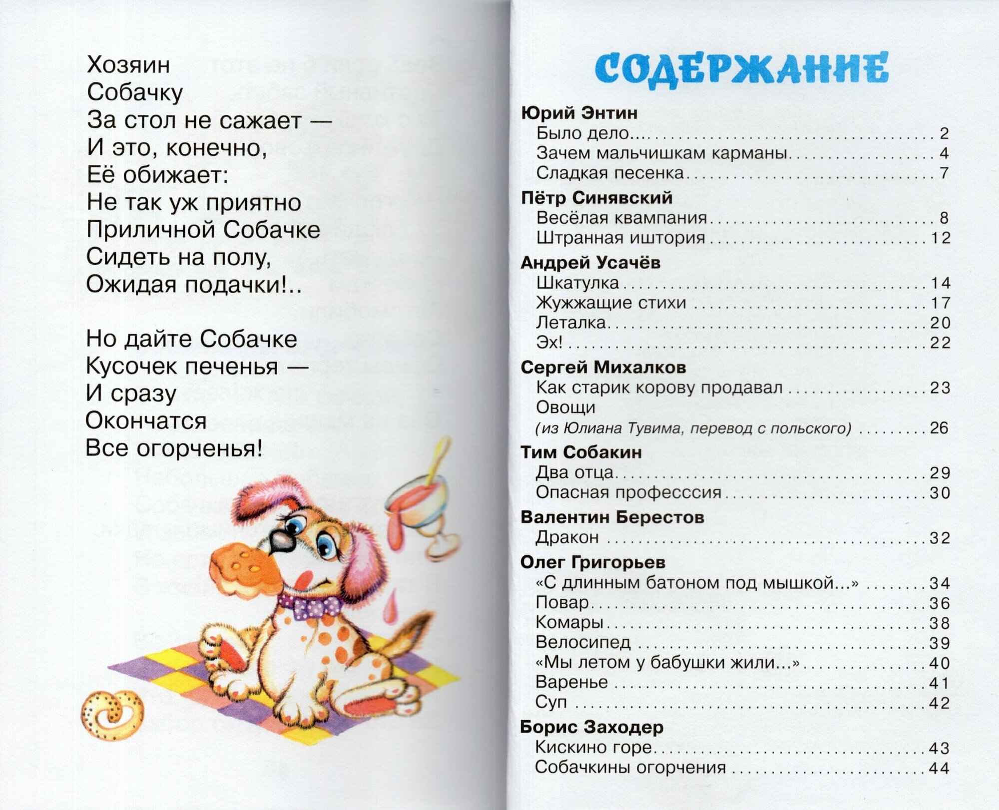В сборник вошли стихи Валентина Берестова, Даниила Хармса, Эдуарда Успенского, Тима Собакина, Олега Григорьева, Андрея Усачева, Петра Синявского, Сергея Михалкова.