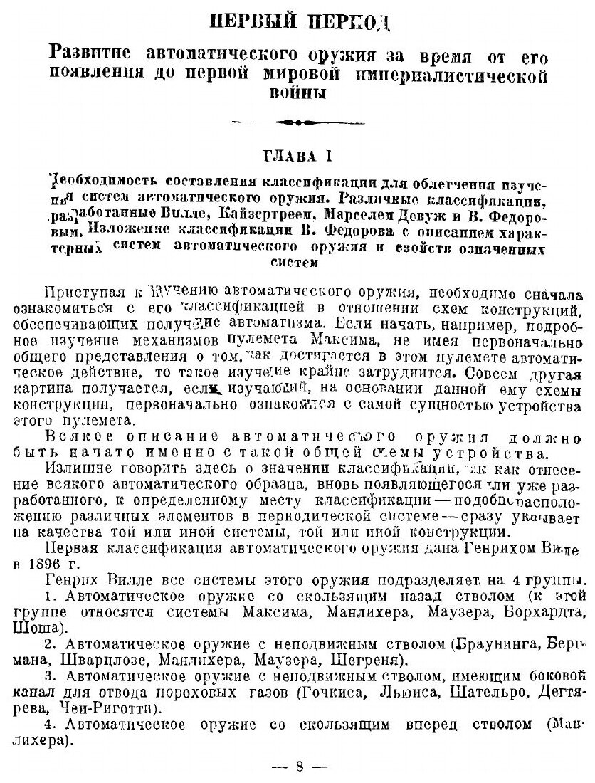 Труд излагает историю развития ручного огнестрельного оружия в России с начала XIX в.I часть труда охватывает период времени от войны с Наполеоном до введения на вооружение магазинной винтовки обр. 1891 г.Во второй части труда автор излагает историю развития автоматического оружии и дает подробные сведения о стрелковом оружии, характеризующем нашу эпоху.Являясь, в основном, пособием при изучении истории оружия, труд в то же время предназначен не только для лиц, занимающихся вопросами оружейного дела, но и представляет интерес для командного и начальствующего состава РККА.