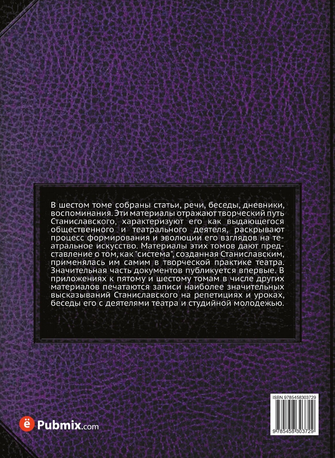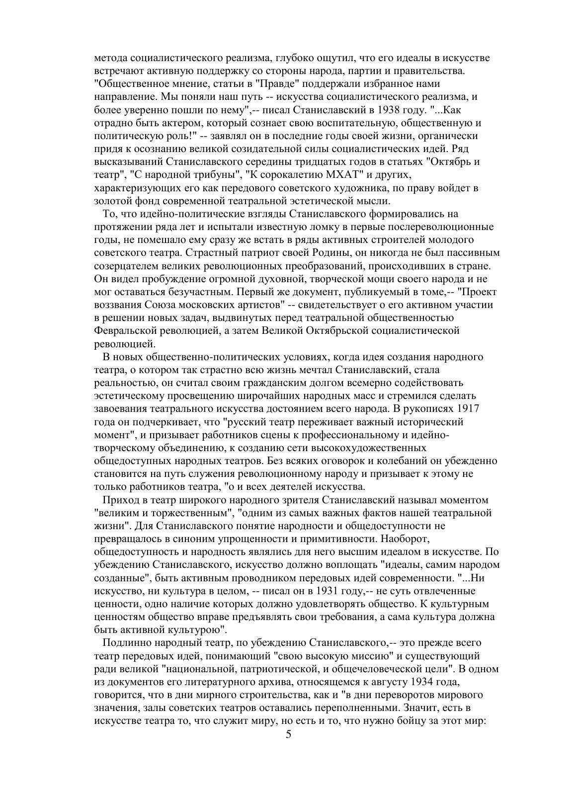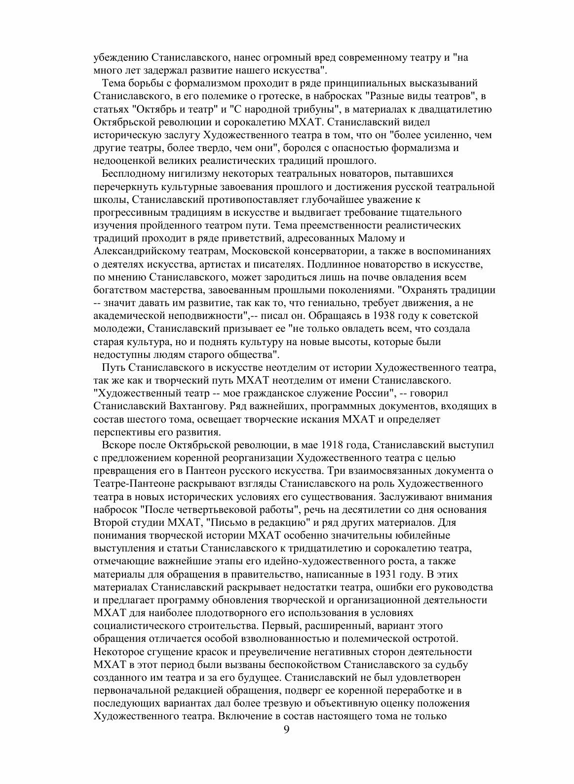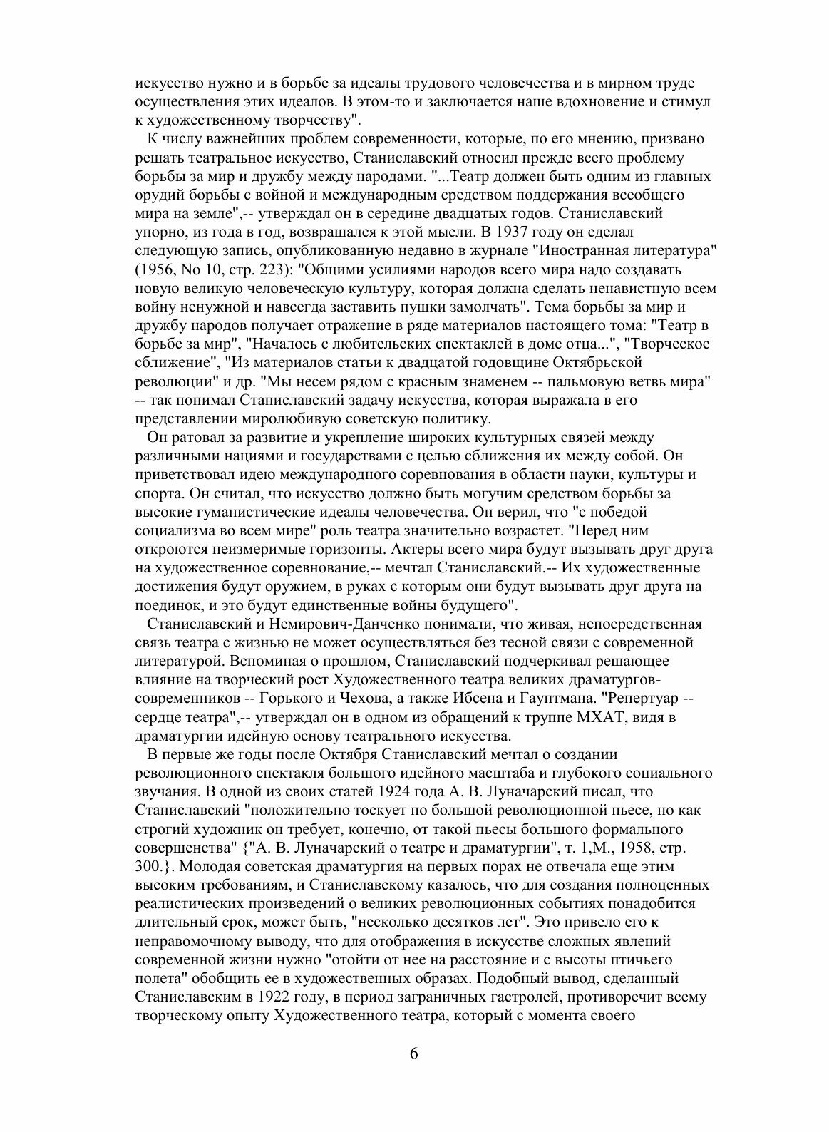 В шестом томе собраны статьи, речи, беседы, дневники, воспоминания. Эти материалы отражают творческий путь Станиславского, характеризуют его как выдающегося общественного и театрального деятеля, раскрывают процесс формирования и эволюции его взглядов на театральное искусство. Материалы этих томов дают представление о том, как "система", созданная Станиславским, применялась им самим в творческой практике театра. Значительная часть документов публикуется впервые. В приложениях к пятому и шестому томам в числе других материалов печатаются записи наиболее значительных высказываний Станиславского на репетициях и уроках, беседы его с деятелями театра и студийной молодежью.