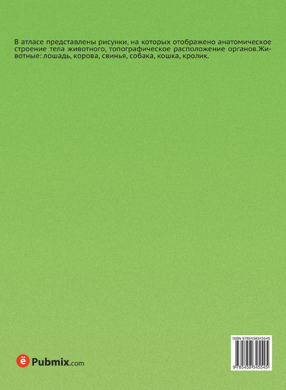 В атласе представлены рисунки, на которых отображено анатомическое строение тела животного, топографическое расположение органов.Животные: лошадь, корова, свинья, собака, кошка, кролик.