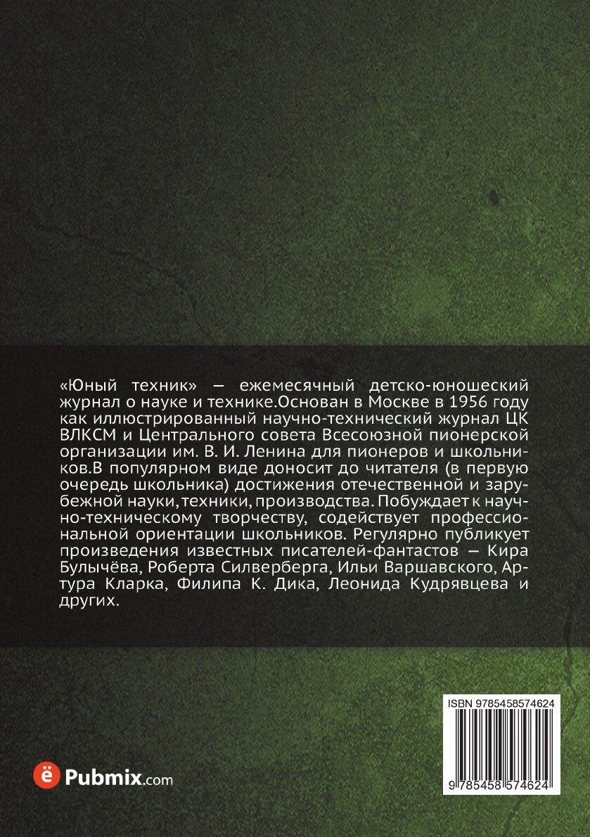 «Юный техник» — ежемесячный детско-юношеский журнал о науке и технике.Основан в Москве в 1956 году как иллюстрированный научно-технический журнал ЦК ВЛКСМ и Центрального совета Всесоюзной пионерской организации им. В. И. Ленина для пионеров и школьников.В популярном виде доносит до читателя (в первую очередь школьника) достижения отечественной и зарубежной науки, техники, производства. Побуждает к научно-техническому творчеству, содействует профессиональной ориентации школьников. Регулярно публикует произведения известных писателей-фантастов — Кира Булычёва, Роберта Силверберга, Ильи Варшавского, Артура Кларка, Филипа К. Дика, Леонида Кудрявцева и других.