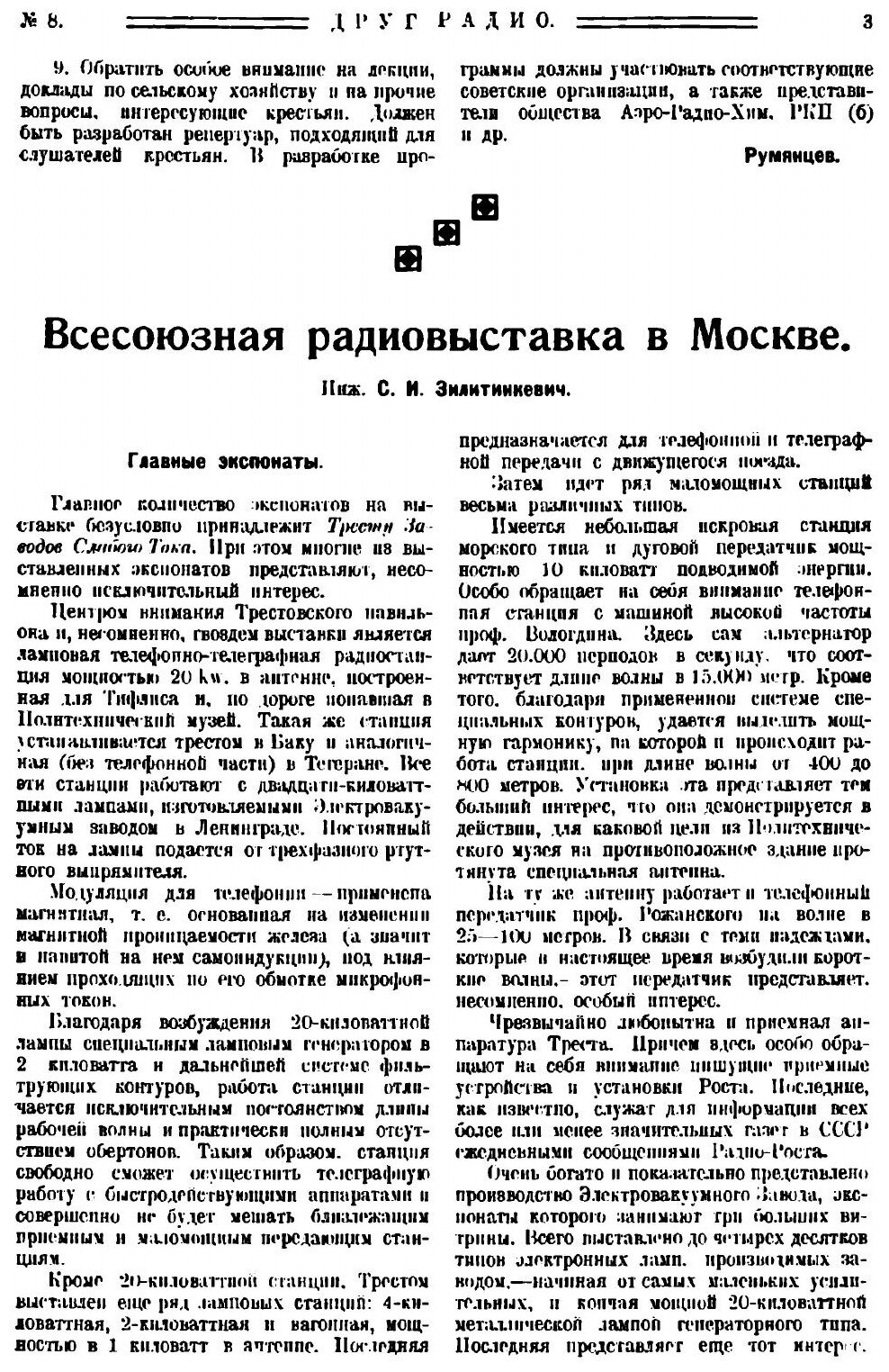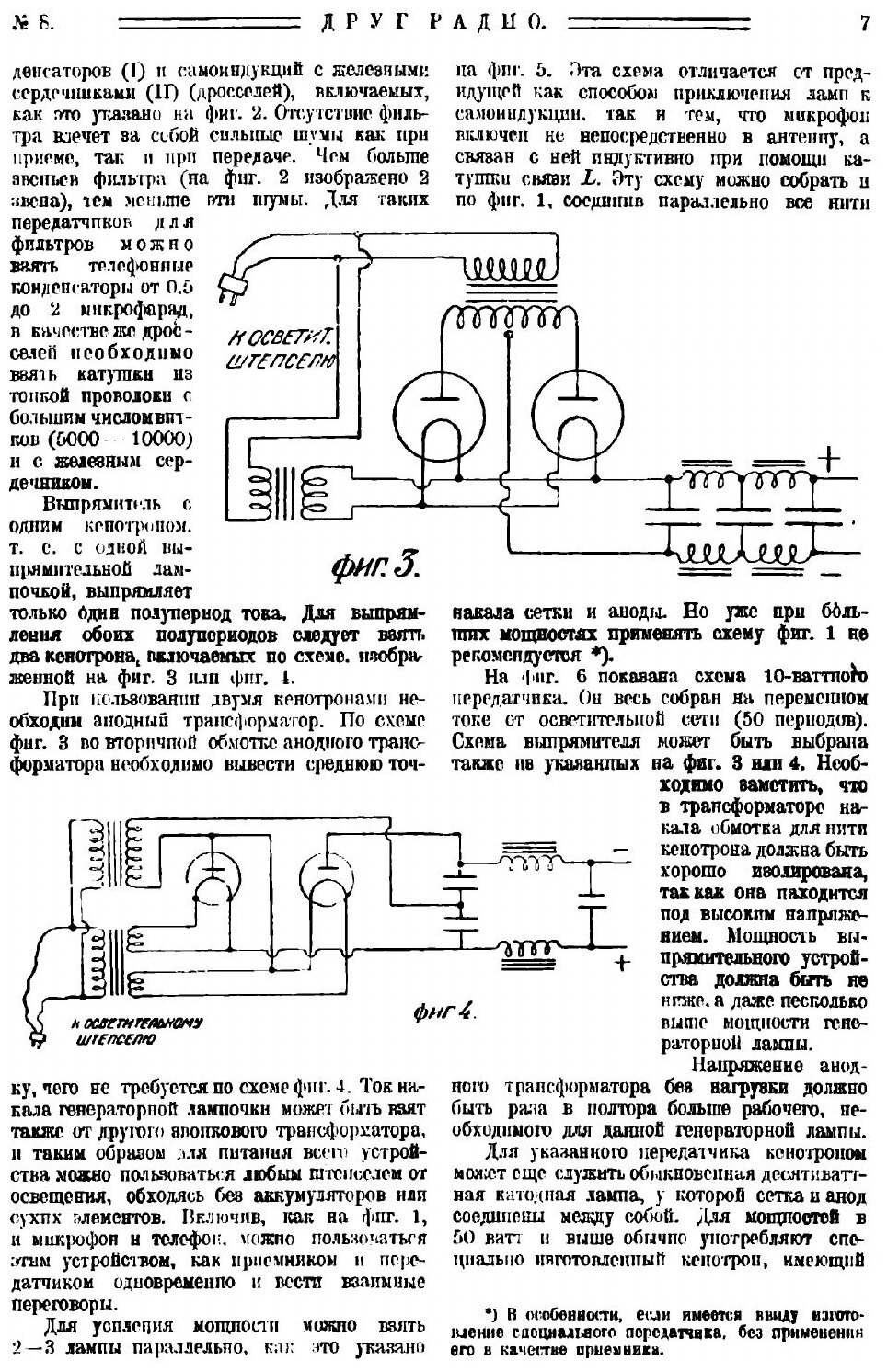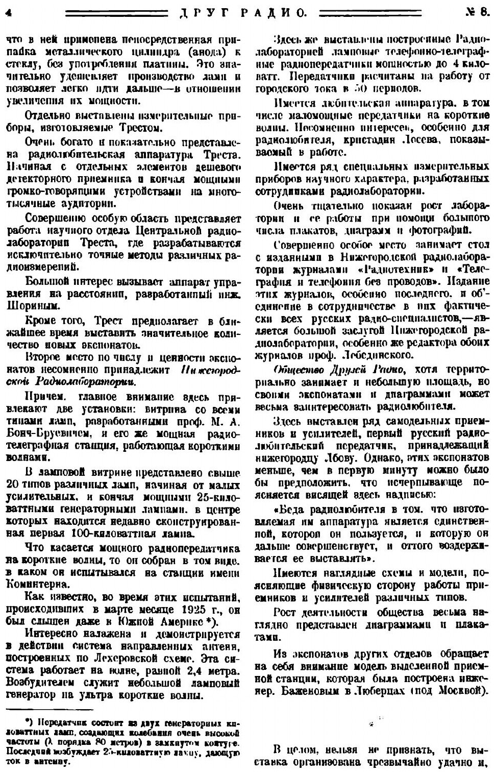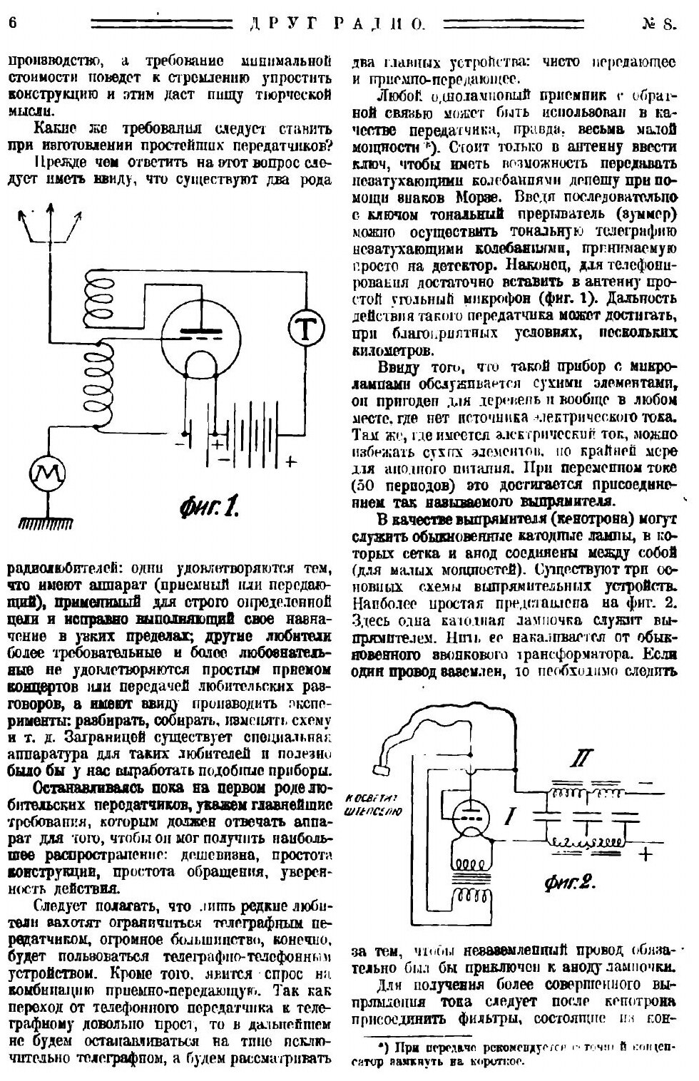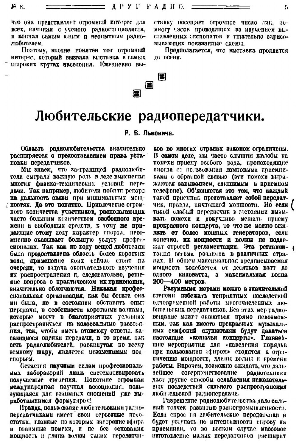 С ноября 1924 года в Ленинграде начал выходить ежемесячный журнал "Друг радио" - орган Общества друзей радио (ОДР) РСФСР и ОДР Северо-Западной области. В N 2 за 1924 год в нем дано определение двух типов радиолюбителей: "Наибольшая часть любителей, хотя и интересуется тайнами радио, т. е. сущностью радиопередачи и приема и устройством приборов, но главным образом стремится пользоваться чудесами радио, слушать речи, концерты. Это - любители радио. Меньшая часть друзей радио интересуется преимущественно научной и технической стороной дела, желает постигнуть тайны радио, чтобы самим научиться воспроизводить его чудеса - это настоящие радиолюбители".