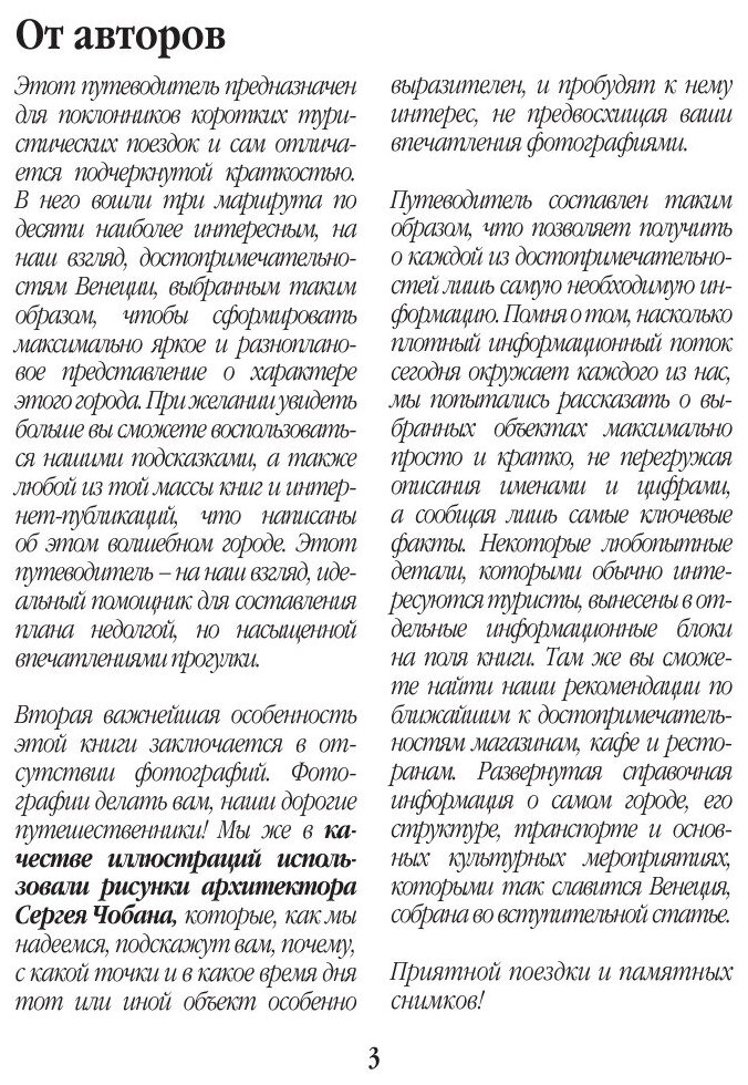 Собираетесь в Венецию на выходные? Эта книга - идеальный помощник для составления плана недолгой, но насыщенной впечатлениями прогулки. «Три дня в Венеции» - краткий путеводитель трёх маршрутов по десяти наиболее интересным достопримечательностям города. В нашем путеводителе вы не найдете фотографий. Фотографии делать вам, дорогие путешественники! Мы же в качестве иллюстраций использовали рисунки архитектора Сергея Чобана, которые подскажут вам, почему, с какой точки и в какое время дня тот или иной объект особенно выразителен и фотогеничен, а возможно, вдохновят на собственные фотографии и рисунки.