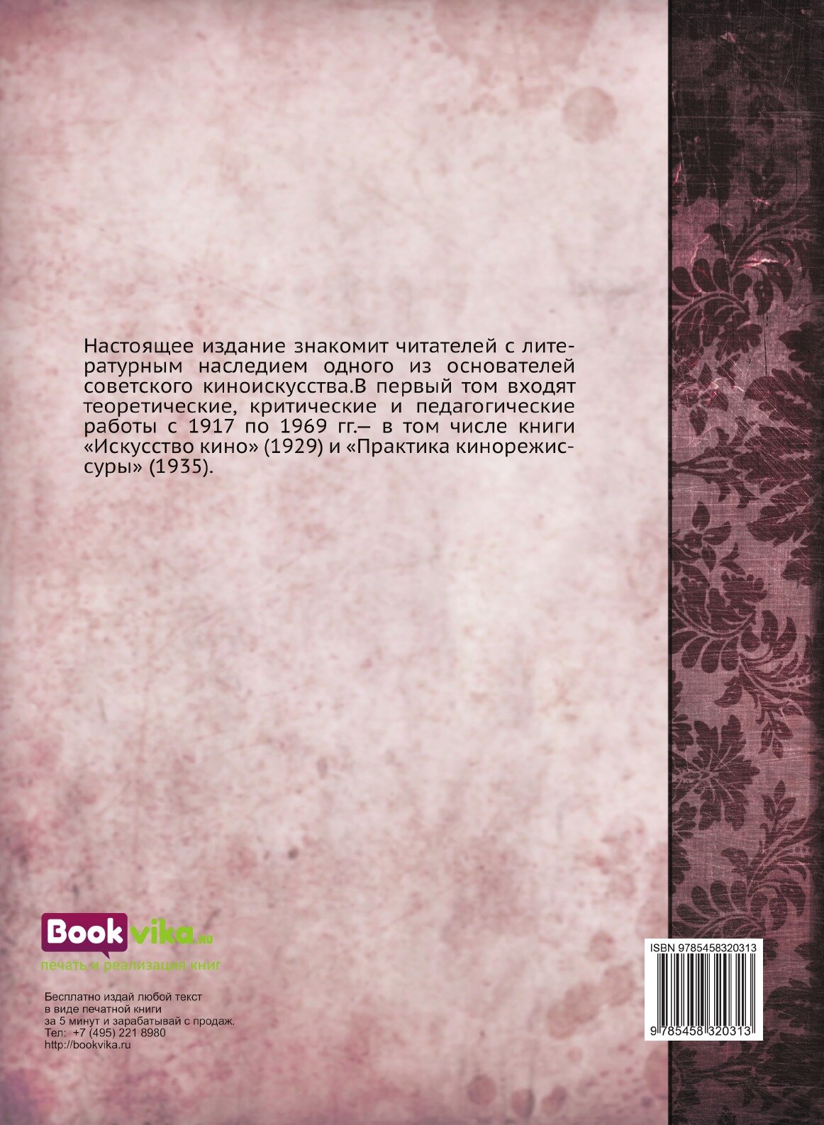 Настоящее издание знакомит читателей с литературным наследием одного из основателей советского киноискусства.В первый том входят теоретические, критические и педагогические работы с 1917 по 1969 гг.— в том числе книги «Искусство кино» (1929) и «Практика кинорежиссуры» (1935).