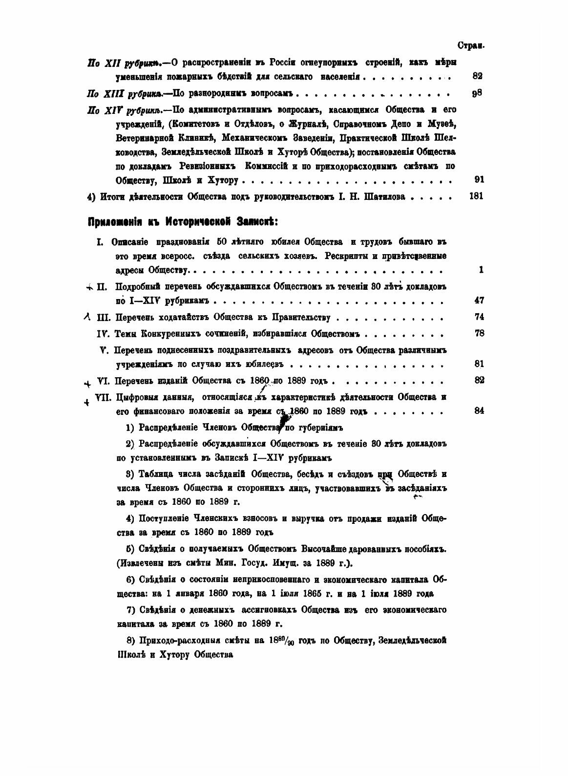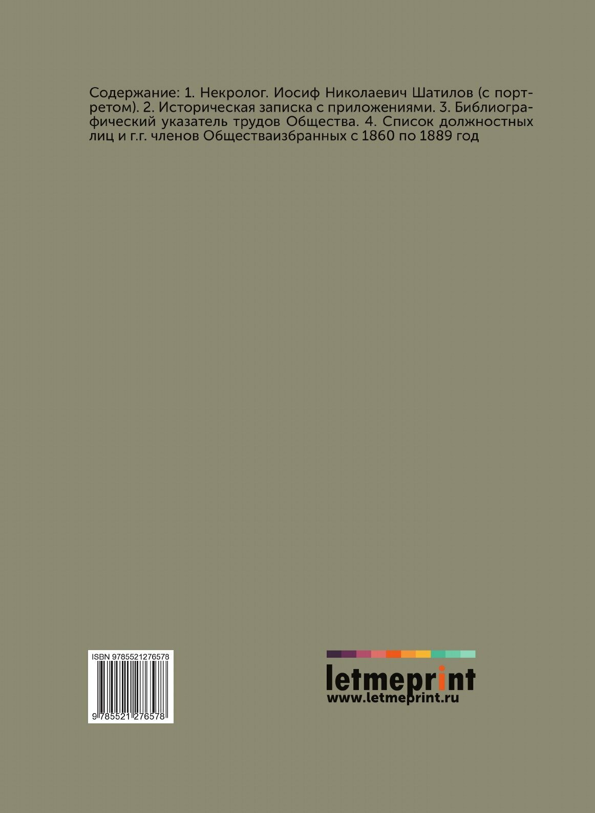 Содержание: 1. Некролог. Иосиф Николаевич Шатилов (с портретом). 2. Историческая записка с приложениями. 3. Библиографический указатель трудов Общества. 4. Список должностных лиц и г.г. членов Обществаизбранных с 1860 по 1889 год