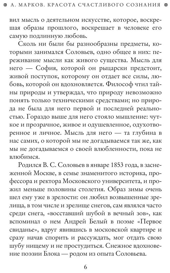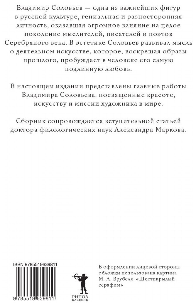 В эстетике Соловьев развил мысль о деятельном искусстве, которое, воскрешая образы прошлого, воскрешает в человеке его самую подлинную любовь. Сколь ни были бы разнообразны предметы, которыми занимался Соловьев, одно общее в них: переживание мысли как живого существа. Мысль для него - та глубина в нас самих, о которой мы не догадываемся так же, как мы не догадываемся о своей влюбленности, пока не влюбимся. В настоящем издании представлены главные работы Владимира Соловьева, посвященные красоте, искусству и миссии художника в мире. Сборник сопровождается вступительной статьей доктора филологических наук Александра Маркова.