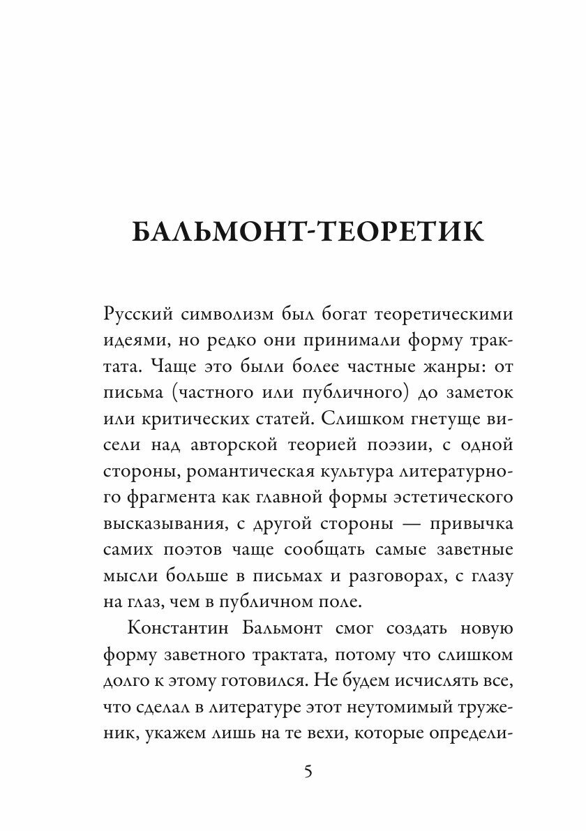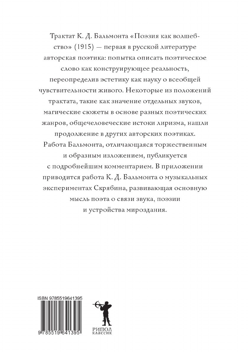 Трактат К.Д. Бальмонта "Поэзия как волшебство" (1915) - первая в русской литературе авторская поэтика: попытка описать поэтическое слово как конструирующее реальность, переопределив эстетику как науку о всеобщей чувствительности живого. Некоторые из положений трактата, такие как значение отдельных звуков, магические сюжеты в основе разных поэтических жанров, общечеловеческие истоки лиризма, нашли продолжение в других авторских поэтиках. Работа Бальмонта, отличающаяся торжественным и образным изложением, публикуется с подробнейшим комментарием. В приложении приводится работа К.Д. Бальмонта о музыкальных экспериментах Скрябина, развивающая основную мысль поэта о связи звука, поэзии и устройства мироздания.