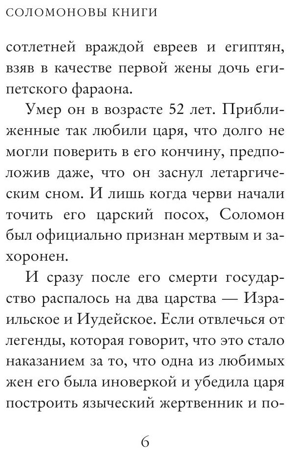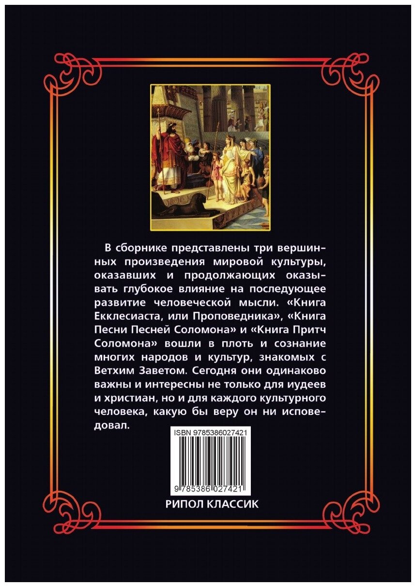 В сборнике представлены три вершинных произведения мировой культуры, оказавших и продолжающих оказывать глубокое влияние на последующее развитие человеческой мысли. "Книга Екклесиаста, или Проповедника", "Книга Песни Песней Соломона" и "Книга Притч Соломона" вошли в плоть и сознание многих народов и культур, знакомых с Ветхим Заветом. Сегодня они одинаково важны и интересны не только для иудеев и христиан, но и для каждого культурного человека, какую бы веру он ни исповедовал.