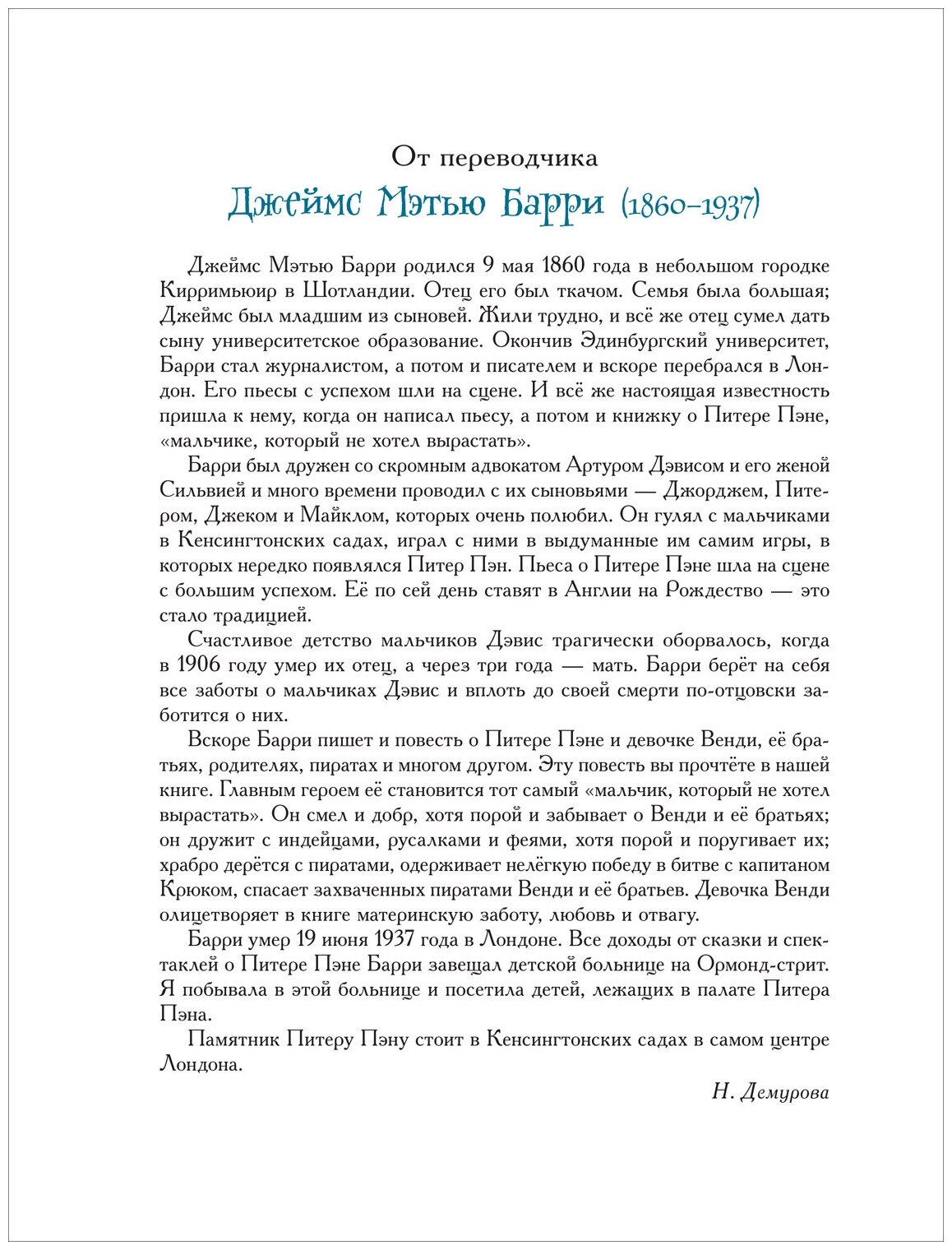 Удивительную историю о мальчике, который не хотел взрослеть, более 100 лет назад сочинил шотландский писатель Джеймс Мэтью Барри. С тех пор она постоянно переиздается на множестве языков, по ней снимают кино, ее адаптируют к театральным постановкам. Этот безусловный шедевр мировой детской литературы в нашем издании представлен в переводе Н.Демуровой. Он считается не только самым полным, но и наиболее удачным. Приятным сюрпризом станут новые, отрисованные специально для этой книги иллюстрации талантливой художницы Н. Климовой, которая уже продемонстрировала свое мастерство в работе над книгой «Таинственный сад», вышедшей весной этого года.ИНТЕРЕСНЫЙ ФАКТ: Считается, что имя Венди придумал именно автор «Питера Пэна» Д.М. Барри и оно стало невероятно популярным.