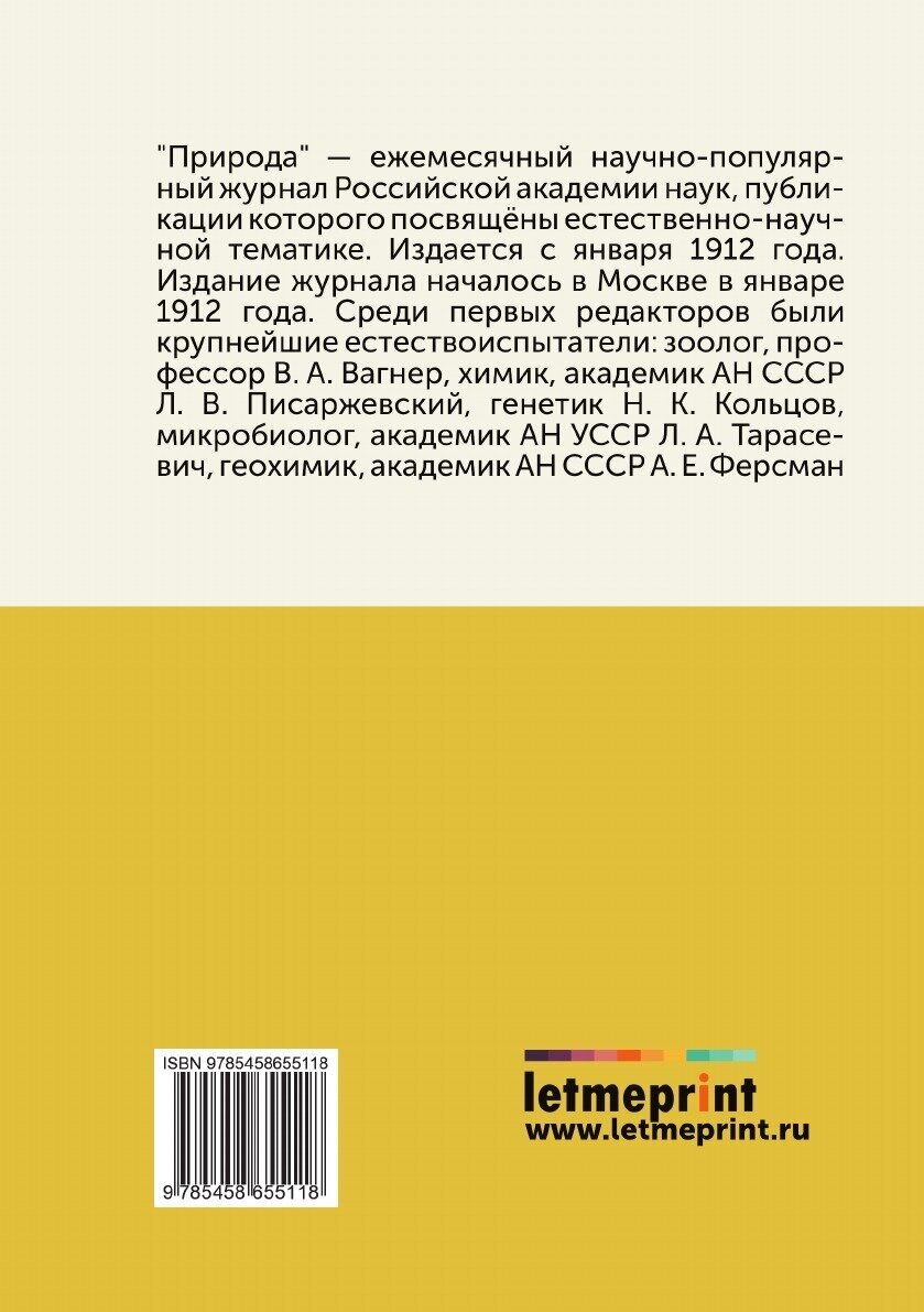 "Природа" — ежемесячный научно-популярный журнал Российской академии наук, публикации которого посвящёны естественно-научной тематике. Издается с января 1912 года. Издание журнала началось в Москве в январе 1912 года. Среди первых редакторов были крупнейшие естествоиспытатели: зоолог, профессор В. А. Вагнер, химик, академик АН СССР Л. В. Писаржевский, генетик Н. К. Кольцов, микробиолог, академик АН УССР Л. А. Тарасевич, геохимик, академик АН СССР А. Е. Ферсман