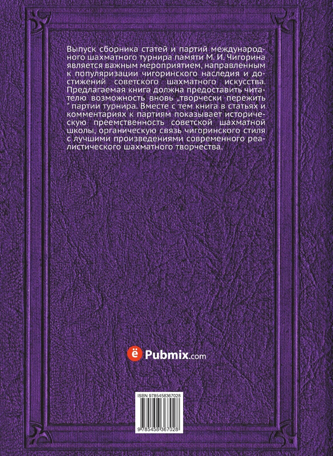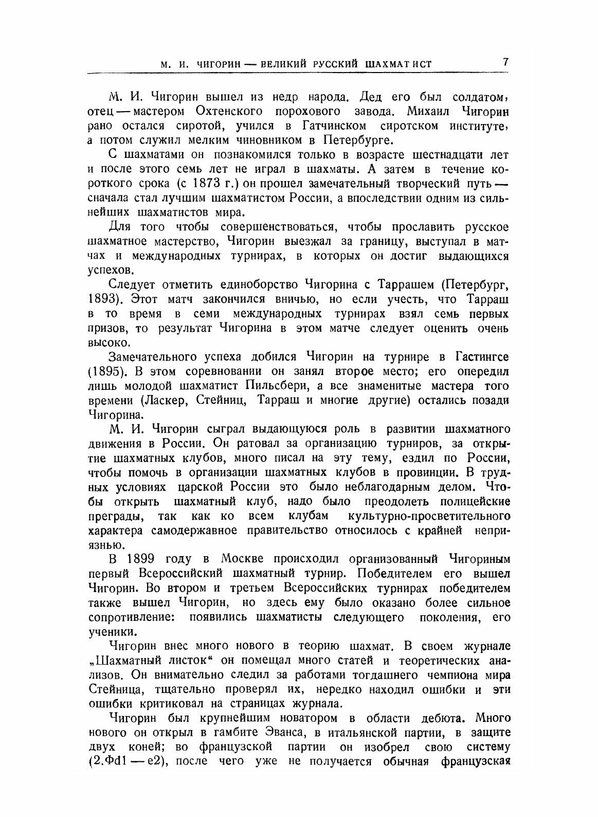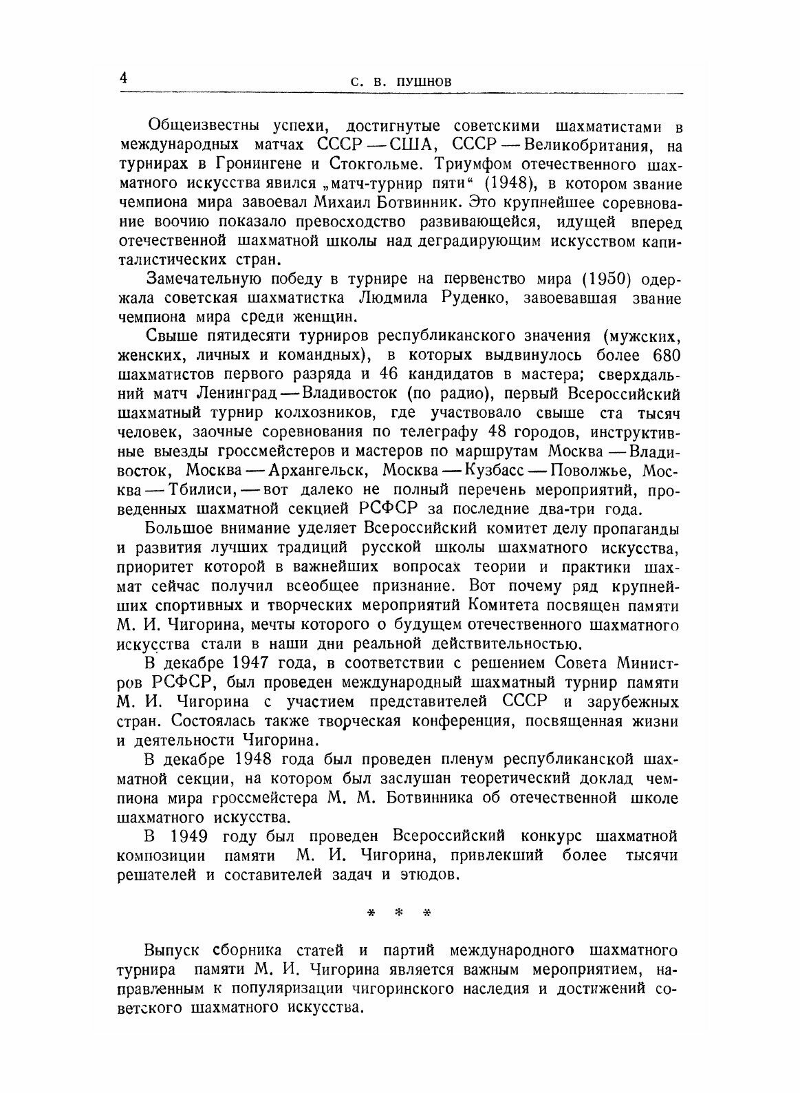 Выпуск сборника статей и партий международного шахматного турнира памяти М. И. Чигорина является важным мероприятием, направленным к популяризации чигоринского наследия и достижений советского шахматного искусства. Предлагаемая книга должна предоставить читателю возможность вновь „творчески пережить" партии турнира. Вместе с тем книга в статьях и комментариях к партиям показывает историческую преемственность советской шахматной школы, органическую связь чигоринского стиля с лучшими произведениями современного реалистического шахматного творчества.