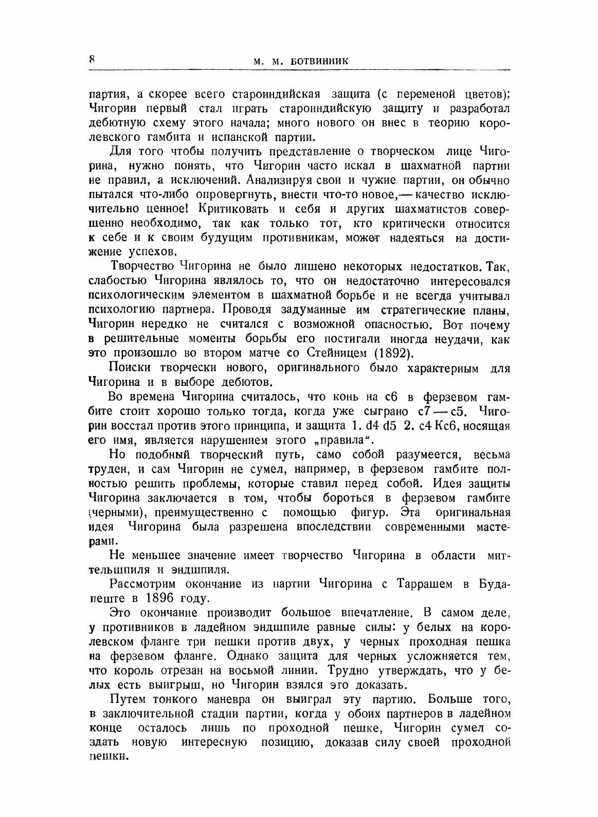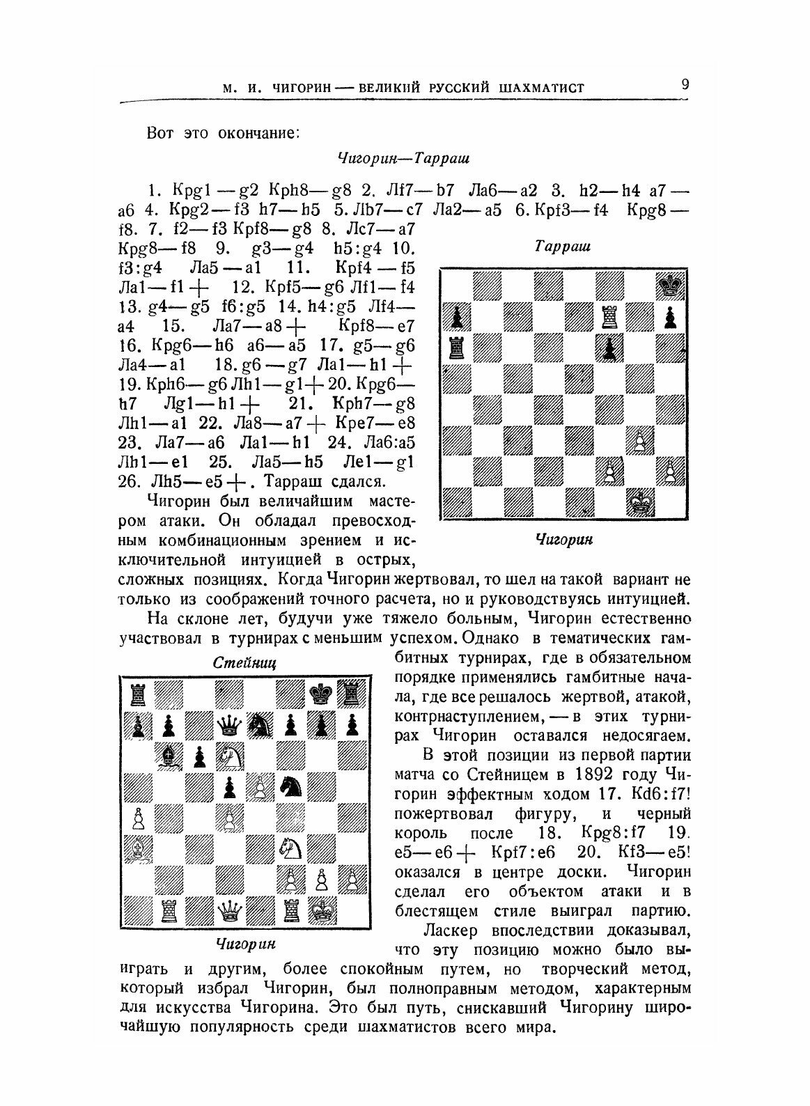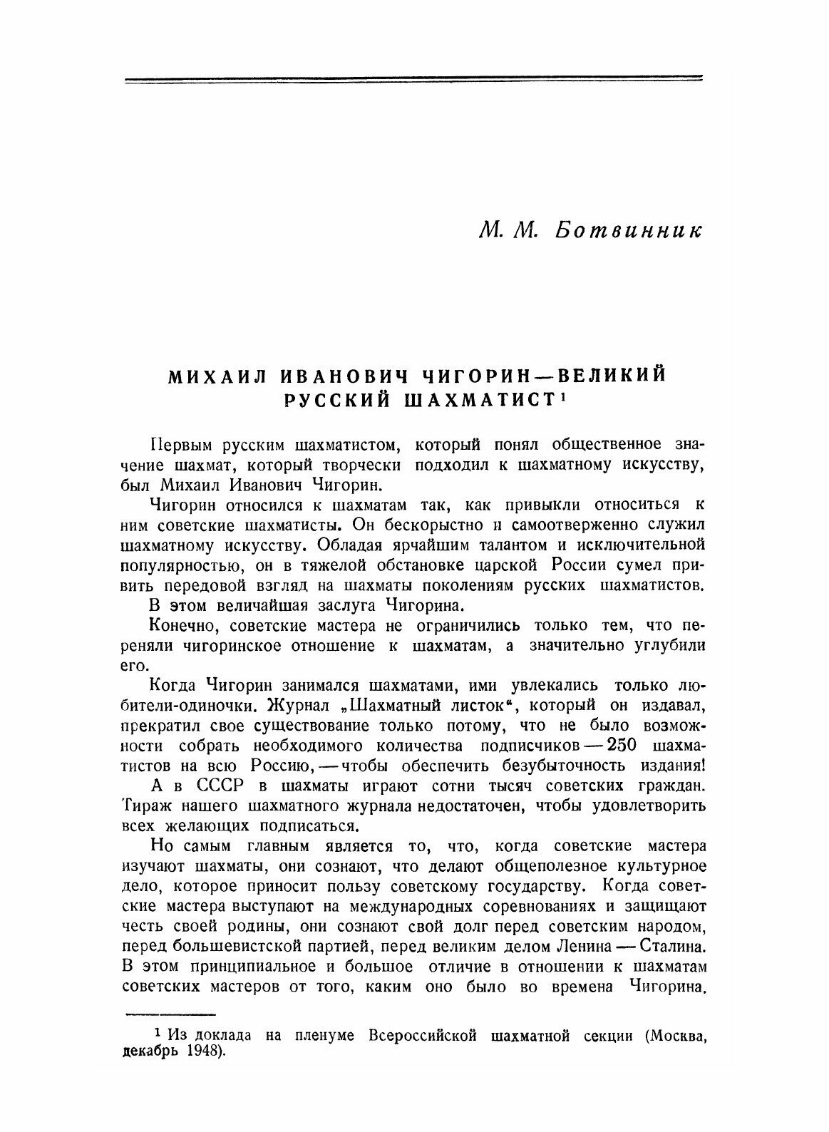 Выпуск сборника статей и партий международного шахматного турнира памяти М. И. Чигорина является важным мероприятием, направленным к популяризации чигоринского наследия и достижений советского шахматного искусства. Предлагаемая книга должна предоставить читателю возможность вновь „творчески пережить" партии турнира. Вместе с тем книга в статьях и комментариях к партиям показывает историческую преемственность советской шахматной школы, органическую связь чигоринского стиля с лучшими произведениями современного реалистического шахматного творчества.