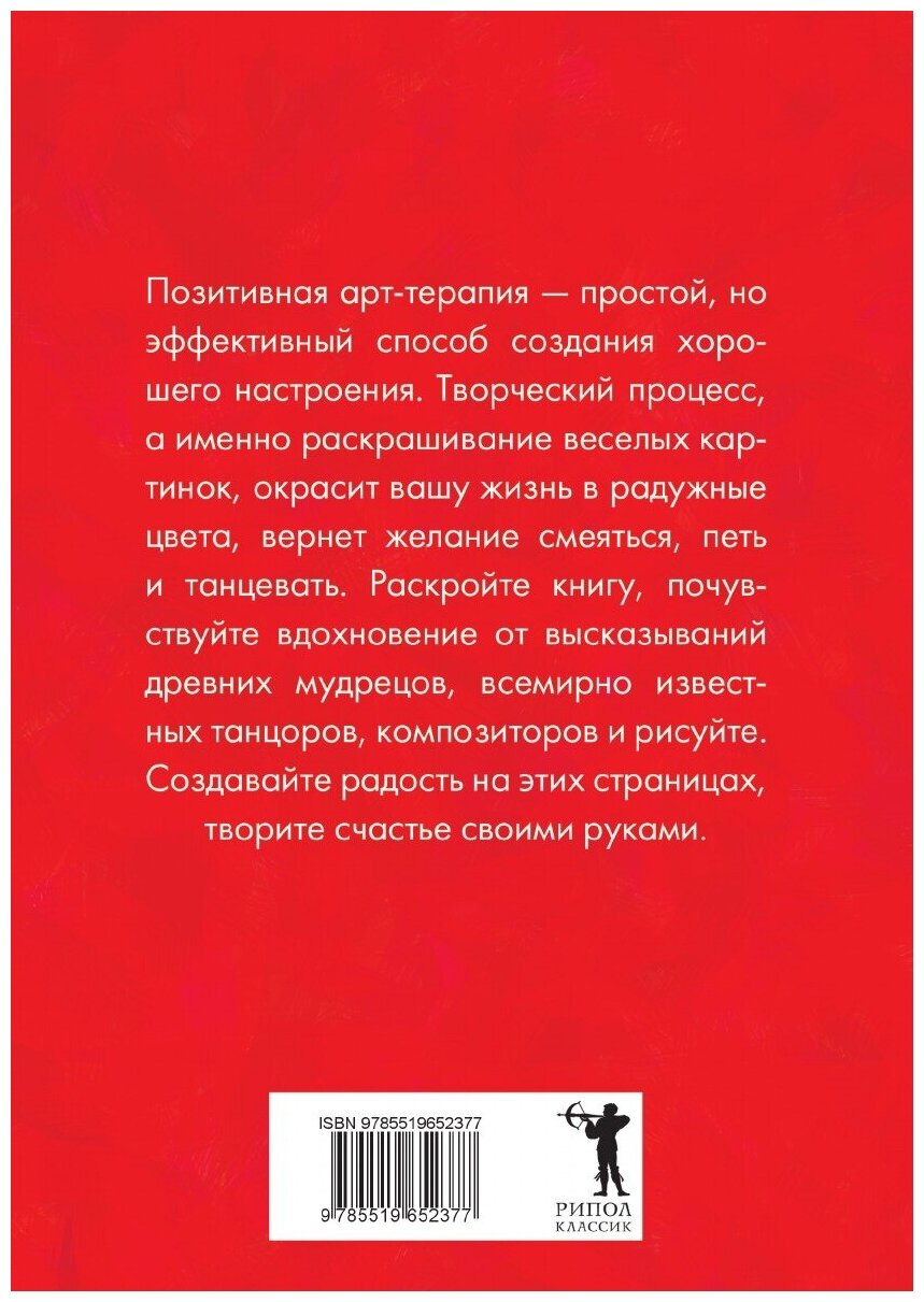 Позитивная арт-терапия — простой, но эффективный способ создания хорошего настроения. Творческий процесс, а именно раскрашивание веселых картинок, окрасит вашу жизнь в радужные цвета, вернет желание смеяться, петь и танцевать. Раскройте книгу, почувствуйте вдохновение от высказываний древних мудрецов, всемирно известных танцоров, композиторов и рисуйте. Создавайте радость на этих страницах, творите счастье своими руками.