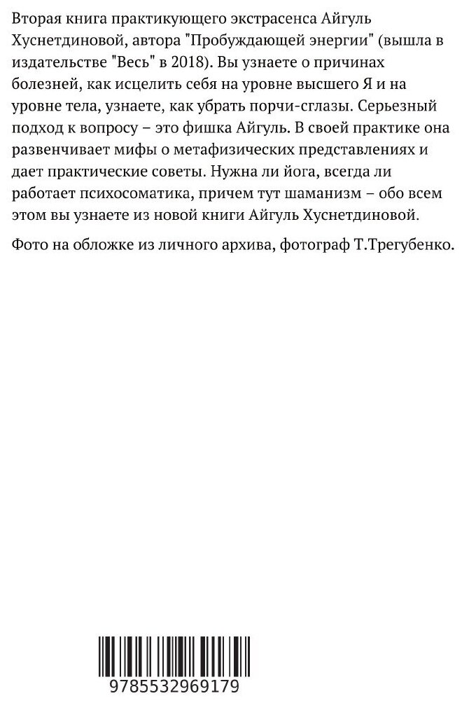 Вторая книга практикующего экстрасенса Айгуль Хуснетдиновой, автора "Пробуждающей энергии" (вышла в издательстве "Весь" в 2018). Вы узнаете о причинах болезней, как исцелить себя на уровне высшего Я и на уровне тела, узнаете, как убрать порчи-сглазы. Серьезный подход к вопросу – это фишка Айгуль. В своей практике она развенчивает мифы о метафизических представлениях и дает практические советы. Нужна ли йога, всегда ли работает психосоматика, причем тут шаманизм – обо всем этом вы узнаете из новой книги Айгуль Хуснетдиновой.Фото на обложке из личного архива, фотограф Т.Трегубенко.
