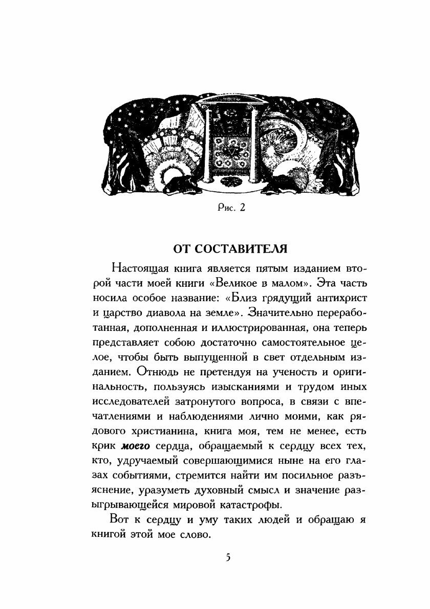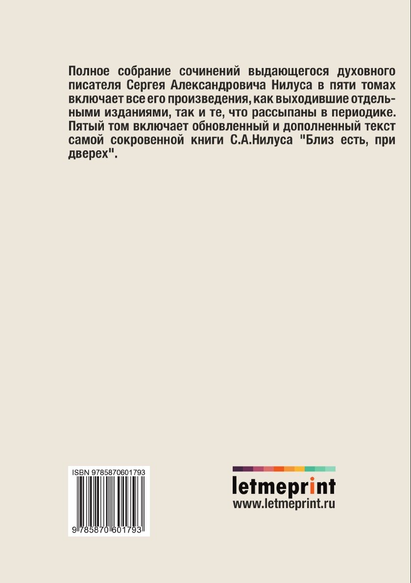 Пятый том Полного собрания сочинений Сергея Александровича Нилуса включает обновленный и дополненный текст самой сокровенной книги С.А. Нилуса "Близ есть, при дверех", набранной и напечатанной непосредственно с подлинной рукописи самого писателя: она чудом уцелела в горниле мировых событий. Пять лет пристального труда над новым, совершенно переделанным вариантом своей книги были сопряжены для С.А. Нилуса с тяжелейшими условиями жизни при большевиках. Но вопреки постоянным обыскам, арестам и смертельным угрозам мысль его и перо его были неостановимы. Полный текст книги завершен был С.А. Нилусом осенью 1923 года. Свыше 400 страниц нового текста было включено им в новое издание, которое выходит в свет только теперь. И как восемь десятилетий назад - все так же живительна его чистая и грозная речь, все так же неподражаемо выразителен он даже в намеках, понятных благочестивым читателям. Издание 5, переделанное и значительно дополненное позднейшими исследованиями и наблюдениями автора
