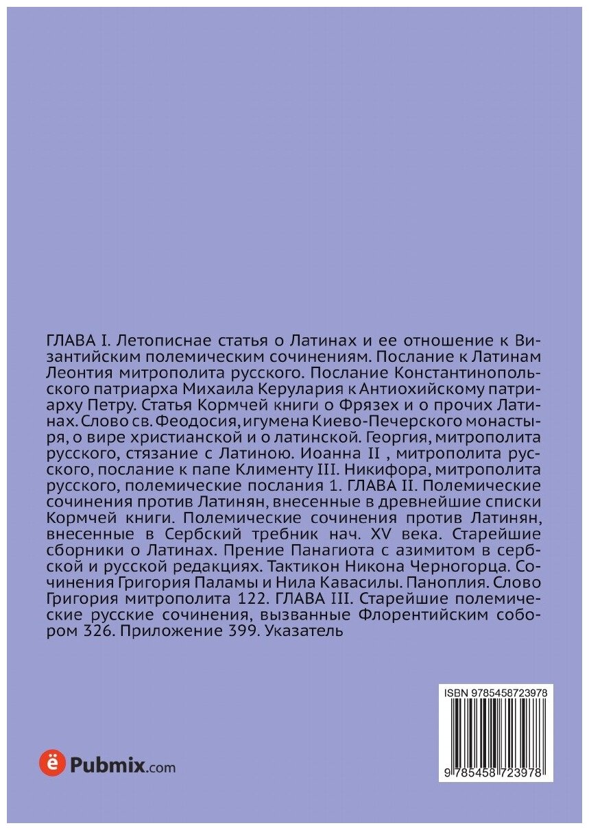 ГЛАВА I. Летописнае статья о Латинах и ее отношение к Византийским полемическим сочинениям. Послание к Латинам Леонтия митрополита русского. Послание Константинопольского патриарха Михаила Керулария к Антиохийскому патриарху Петру. Статья Кормчей книги о Фрязех и о прочих Латинах. Слово св. Феодосия, игумена Киево-Печерского монастыря, о вире христианской и о латинской. Георгия, митрополита русского, стязание с Латиною. Иоанна II , митрополита русского, послание к папе Клименту III. Никифора, митрополита русского, полемические послания 1. ГЛАВА II. Полемические сочинения против Латинян, внесенные в древнейшие списки Кормчей книги. Полемические сочинения против Латинян, внесенные в Сербский требник нач. XV века. Старейшие сборники о Латинах. Прениe Панагиота с азимитом в сербской и русской редакциях. Тактикон Никона Черногорца. Сочинения Григория Паламы и Нила Кавасилы. Паноплия. Слово Григория митрополита 122. ГЛАВА III. Старейшие полемические русские сочинения, вызванные Флорентийским собором 326. Приложение 399. Указатель