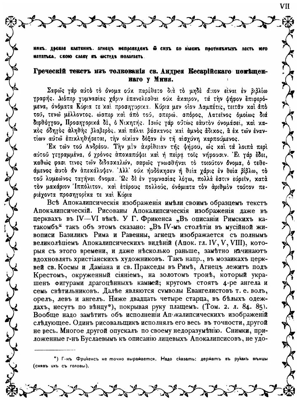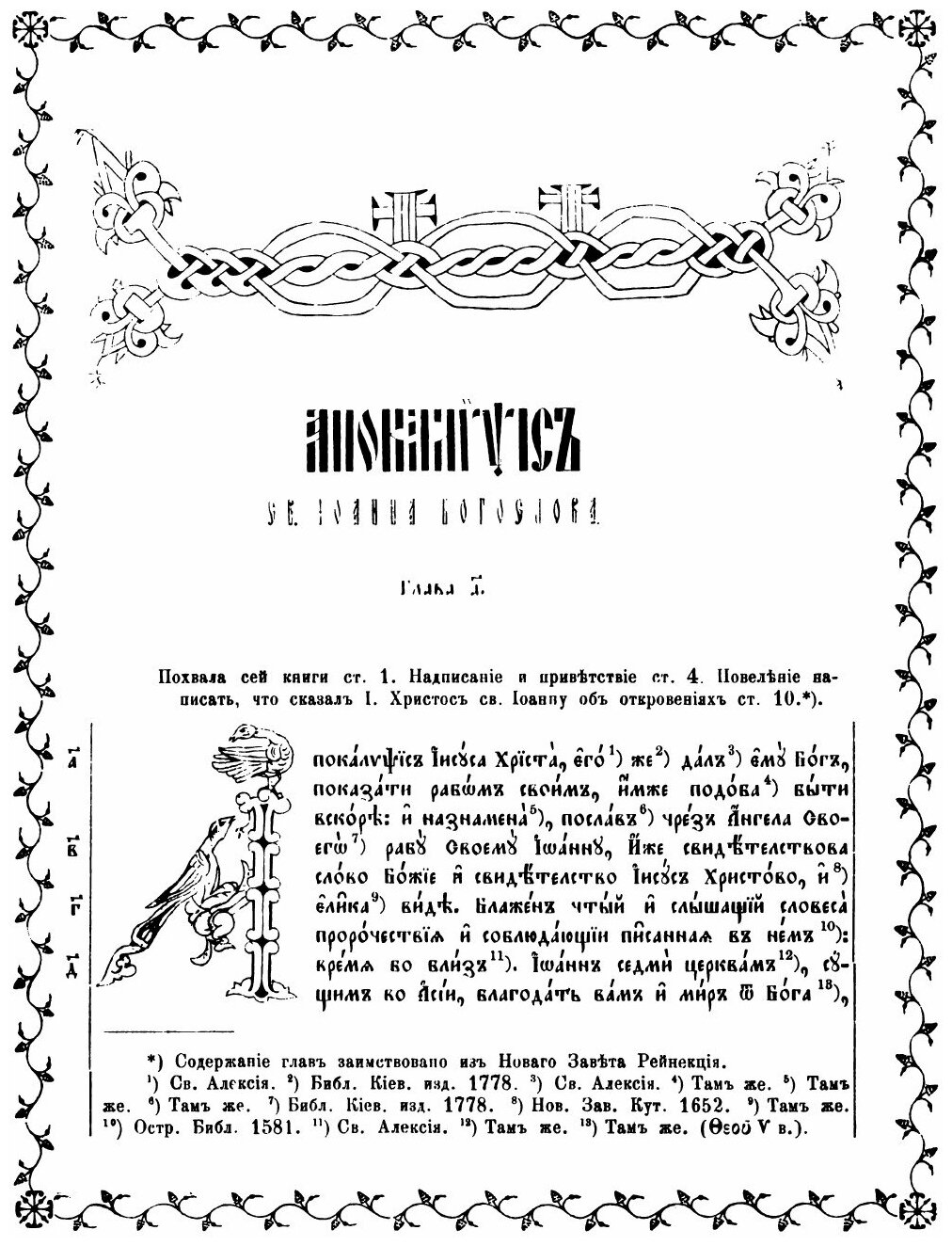 Текст Апокалипсиса по списку XIV в. Румянцевского музея, помещенный здесь, исправлен преимущественно по древнейшему Апокалипсическому списку, писанному рукою знаменитейшего нашего Русского ученого и святого Алексия митрополита всея России. Не смотря на управление паствою всея России, доставало времени у св. Алексия, исправить весь Новый Завет по Греческому подлиннику и переписать собственноручно весь исправленный им текст Нового Завета на не больших пергаментных 169 осмушках в единственном экземпляре.