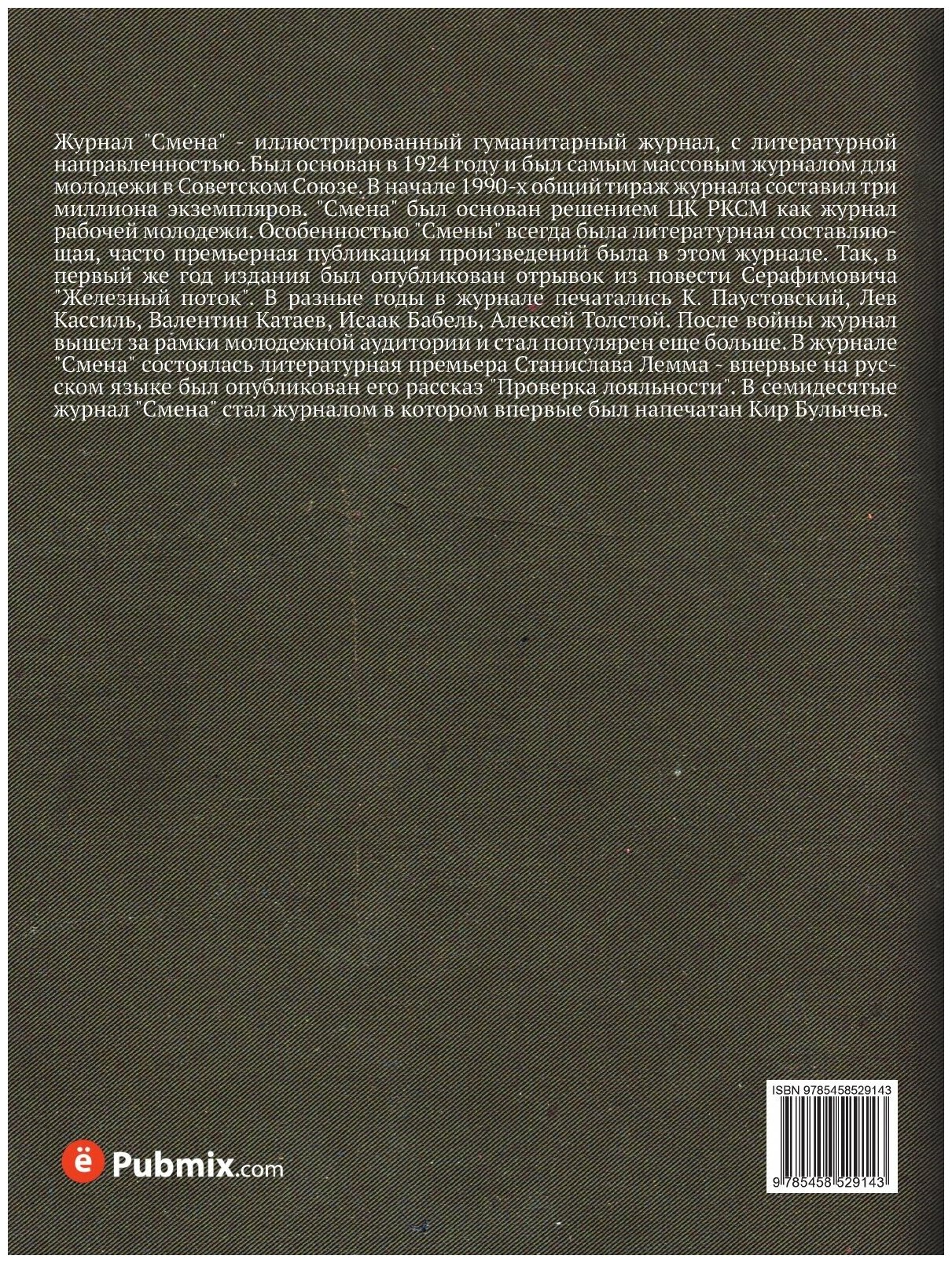 Журнал "Смена" - иллюстрированный гуманитарный журнал, с литературной направленностью. Был основан в 1924 году и был самым массовым журналом для молодежи в Советском Союзе. В начале 1990-х общий тираж журнала составил три миллиона экземпляров. "Смена" был основан решением ЦК РКСМ как журнал рабочей молодежи. Особенностью "Смены" всегда была литературная составляющая, часто премьерная публикация произведений была в этом журнале. Так, в первый же год издания был опубликован отрывок из повести Серафимовича "Железный поток". В разные годы в журнале печатались К. Паустовский, Лев Кассиль, Валентин Катаев, Исаак Бабель, Алексей Толстой. После войны журнал вышел за рамки молодежной аудитории и стал популярен еще больше. В журнале "Смена" состоялась литературная премьера Станислава Лемма - впервые на русском языке был опубликован его рассказ "Проверка лояльности". В семидесятые журнал "Смена" стал журналом в котором впервые был напечатан Кир Булычев.